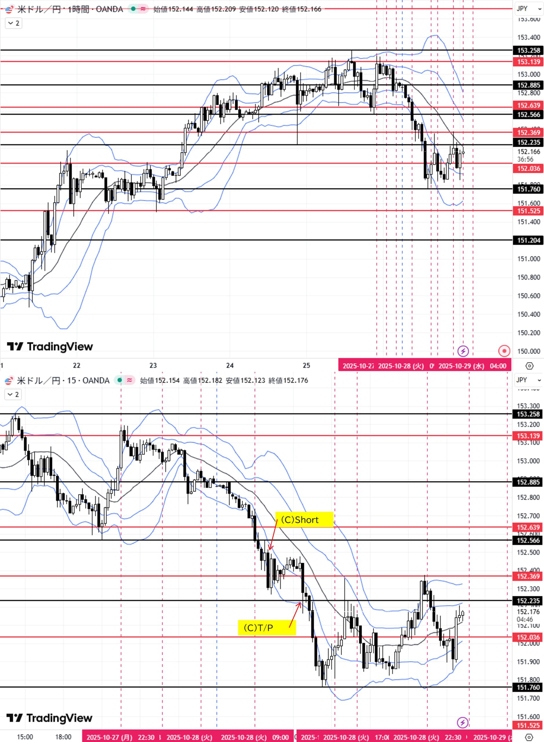 (C)1H足レンジ安値152.639をダウ下落→目標日足安値152.235