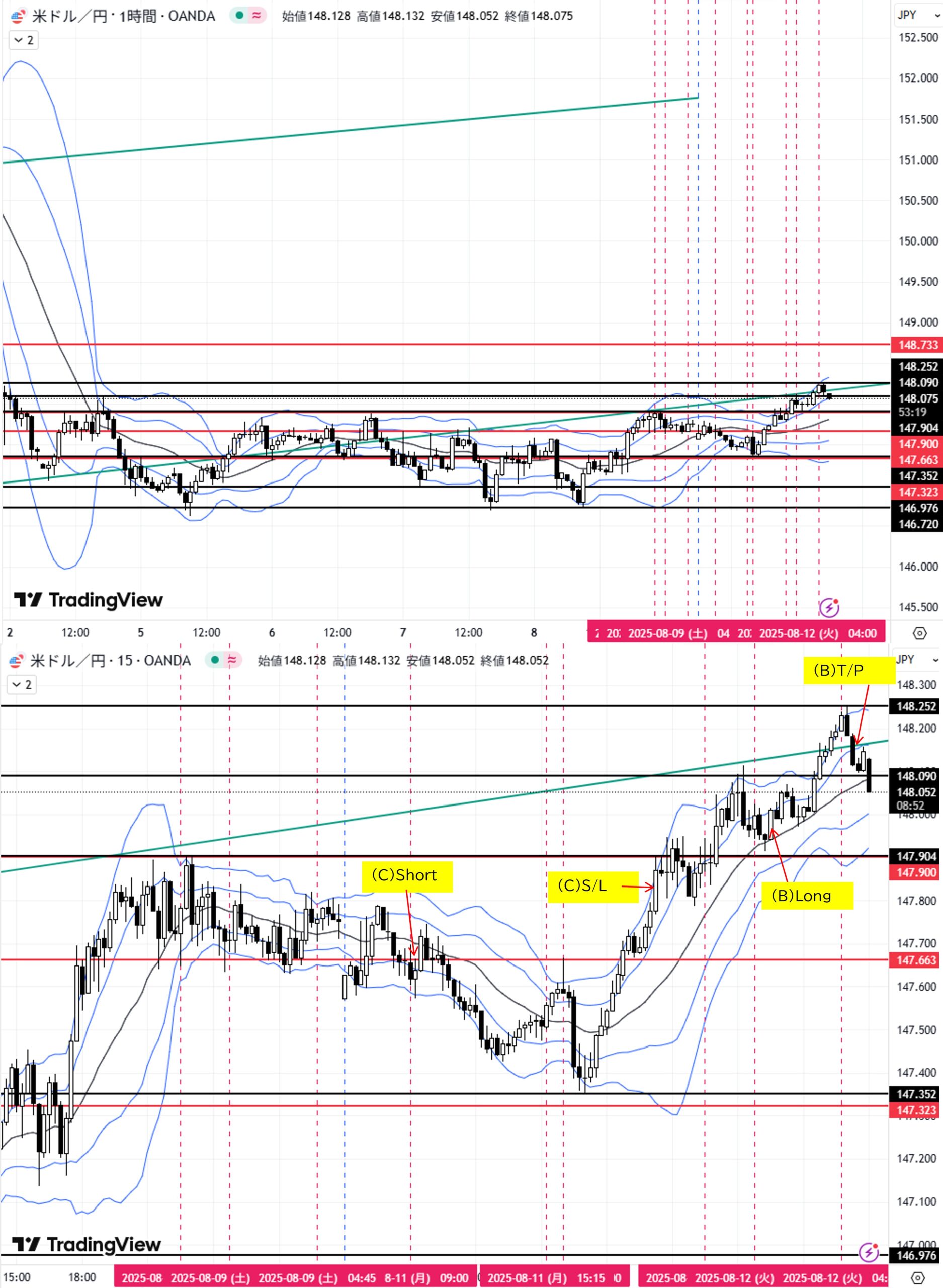 (B)日足高値147.904をダウ上昇→目標1H足押し安値148.733