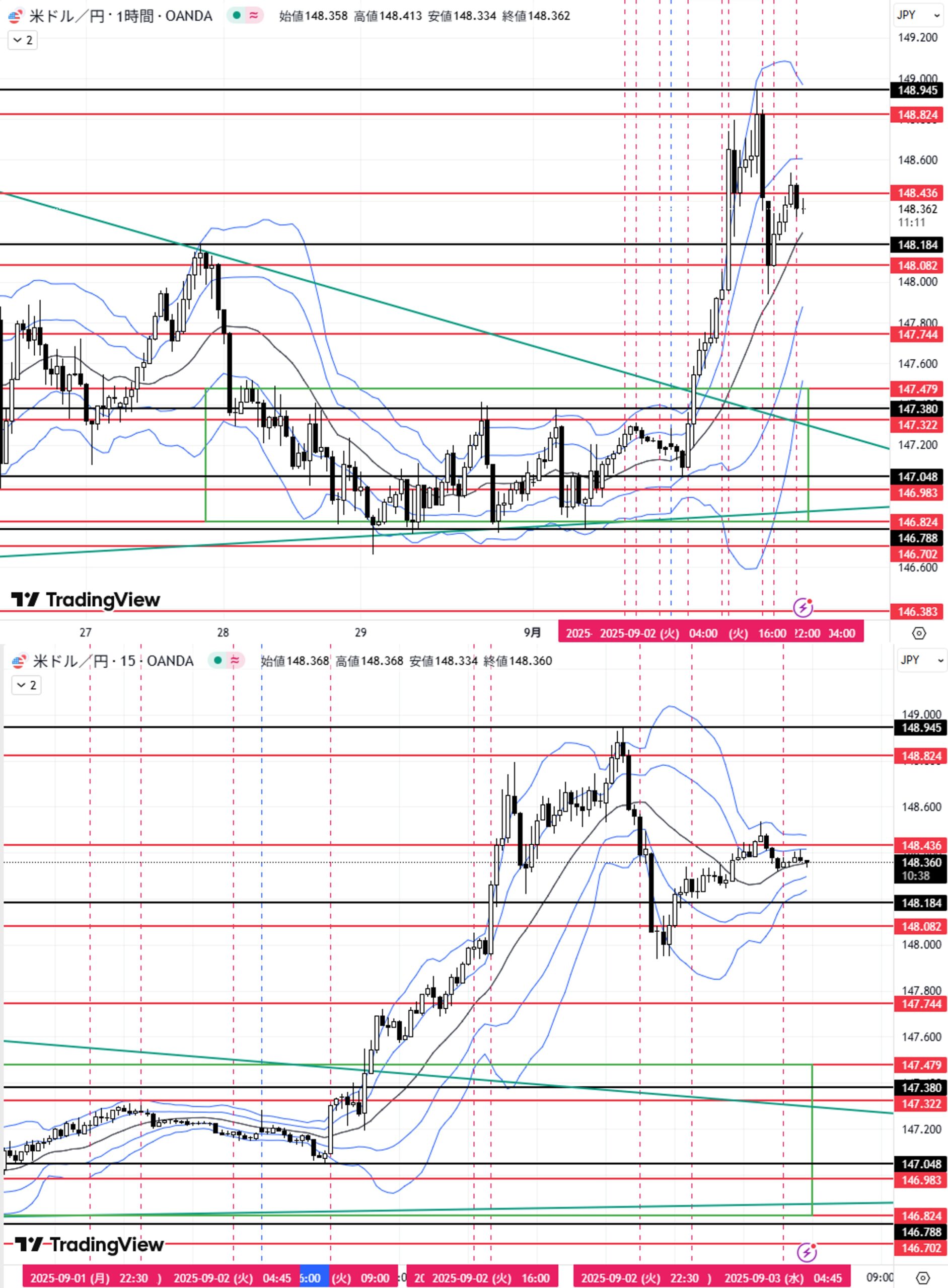 (B)1H足戻り高値147.479をダウ上昇→目標日足戻り高値147.744