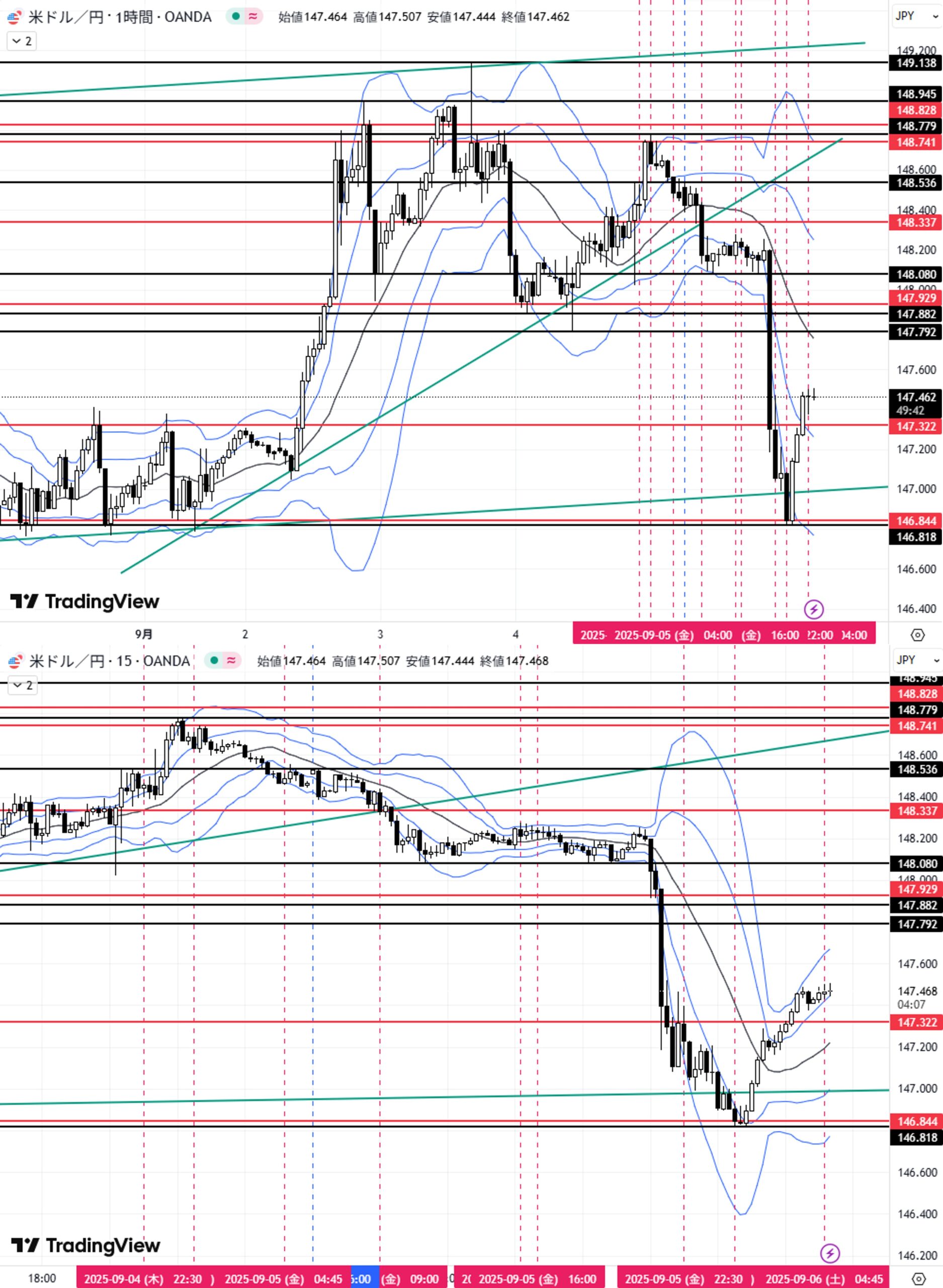 (B)1H足レンジ高値148.741をダウ上昇→目標日足高値149.138
