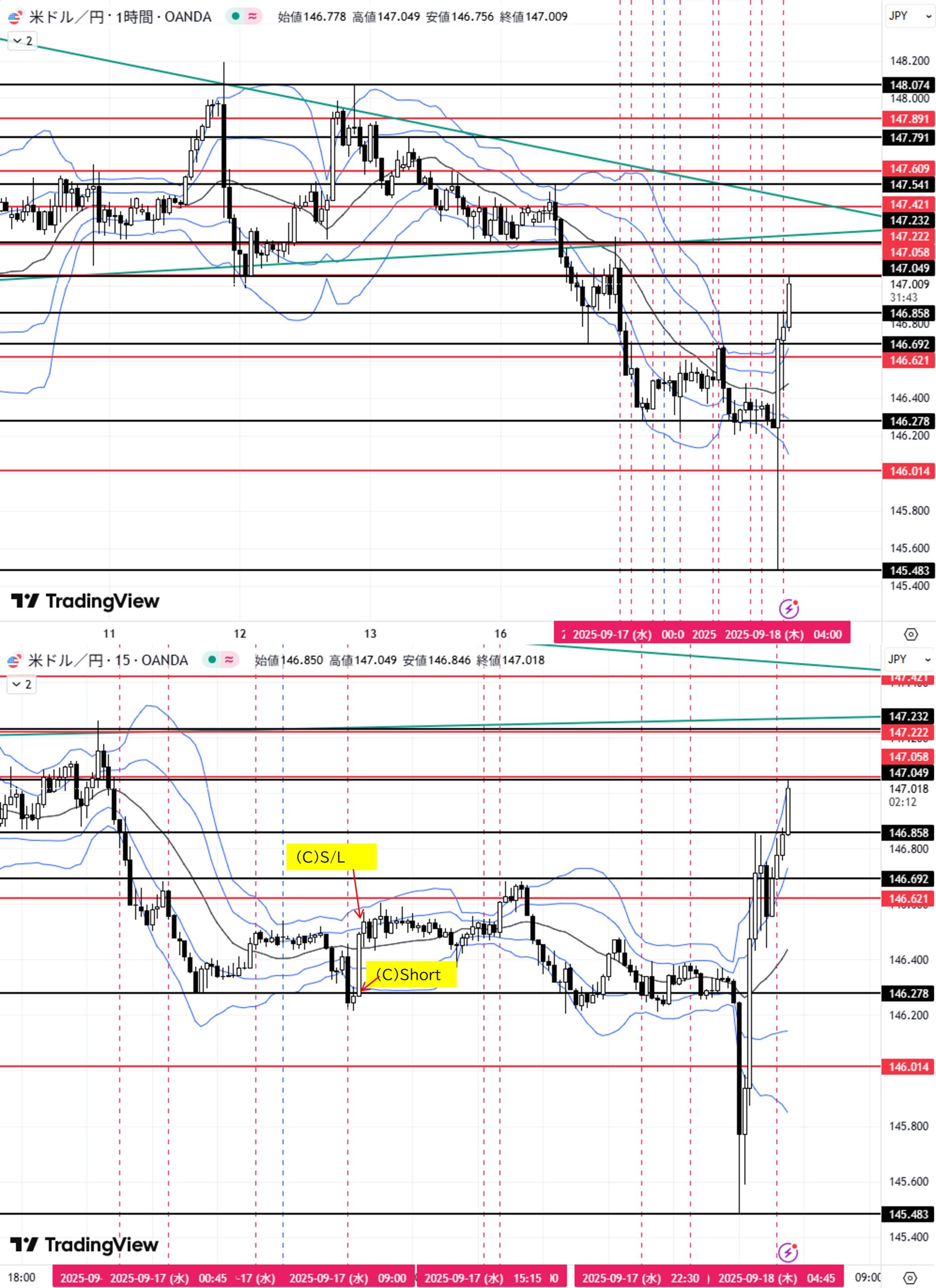 (C)日足安値146.278をダウ下落→4H足押し安値146.014