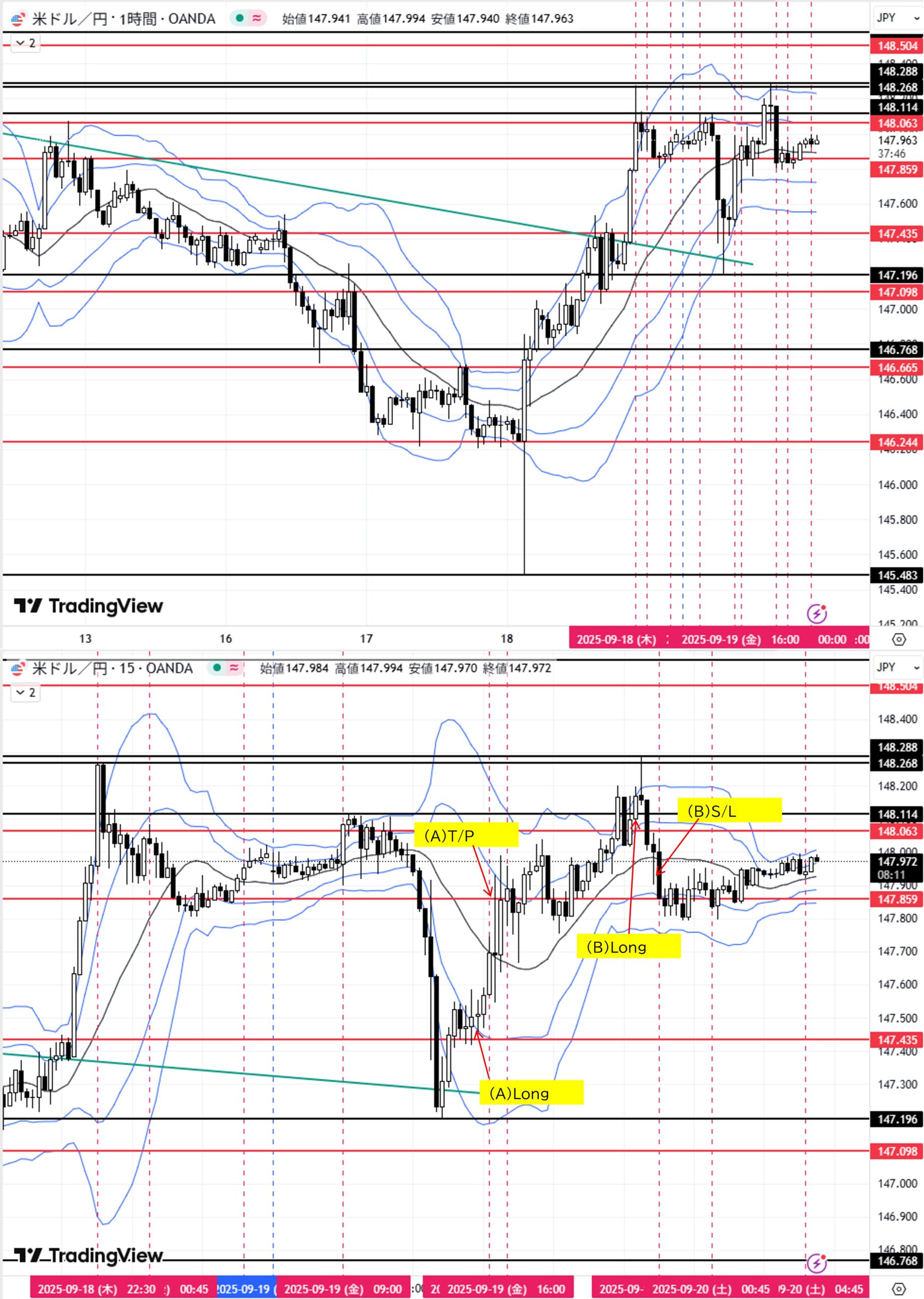 (B)1H足レンジ高値148.063をダウ上昇→目標日足戻り高値148.504
