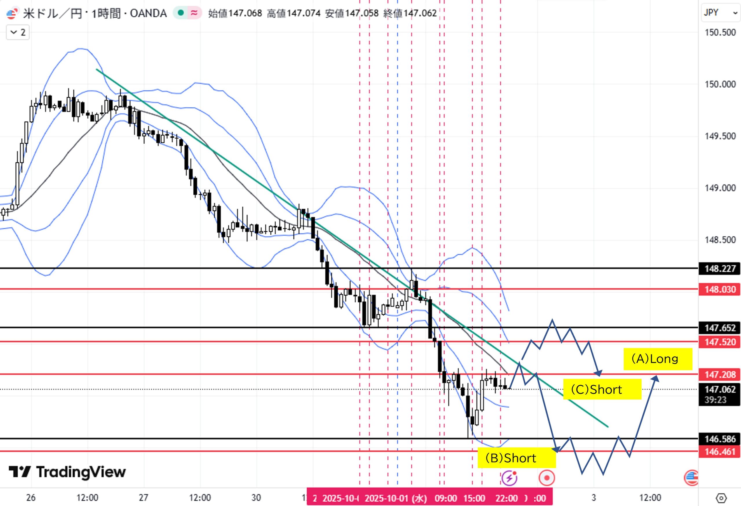 (C)4H足レンジ安値147.520付近へ上昇→転換下落→目標1H足戻り高値147.208