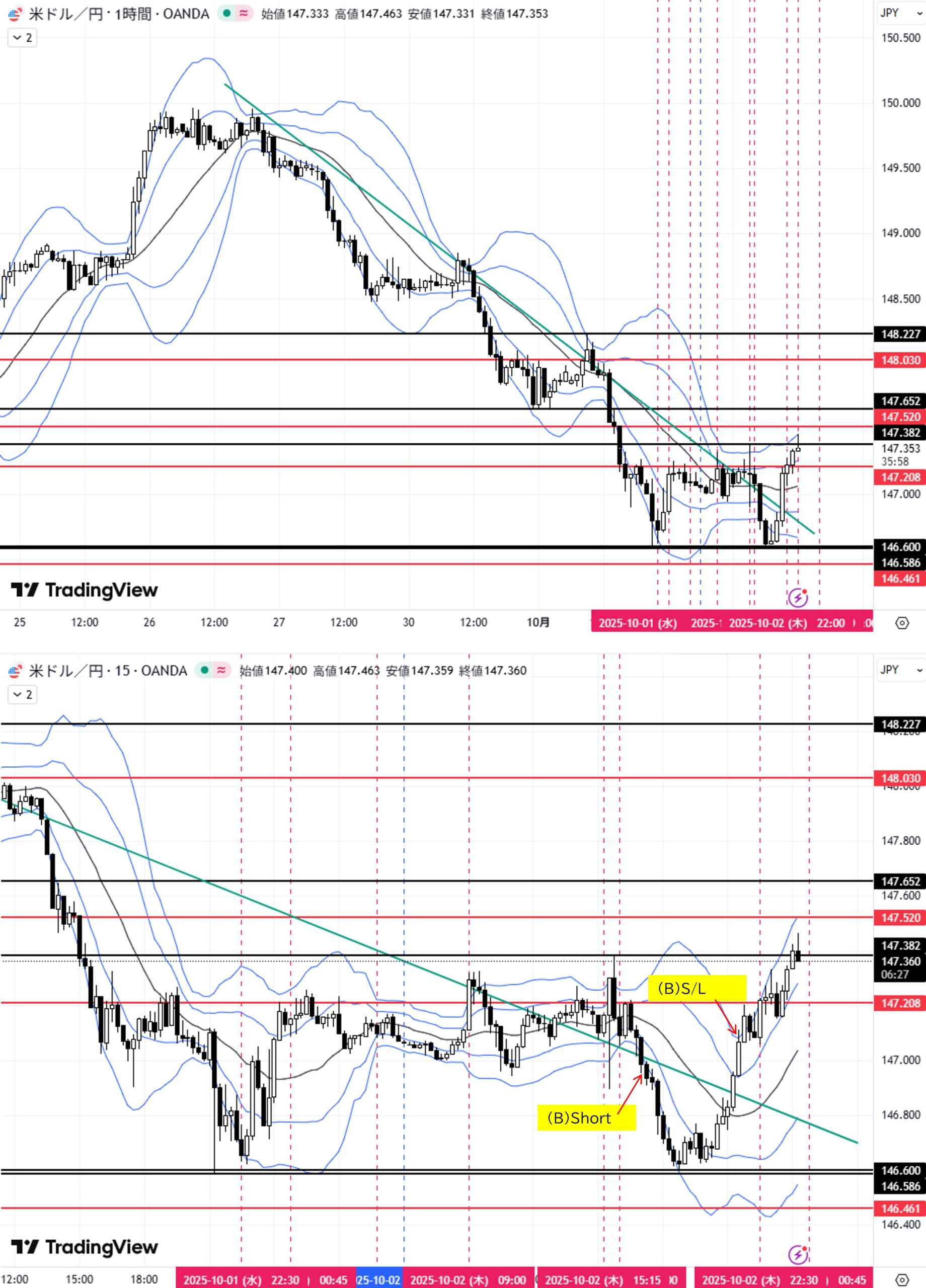 (B)1H足戻り高値147.208付近へ上昇→転換下落→目標日足押し安値146.461