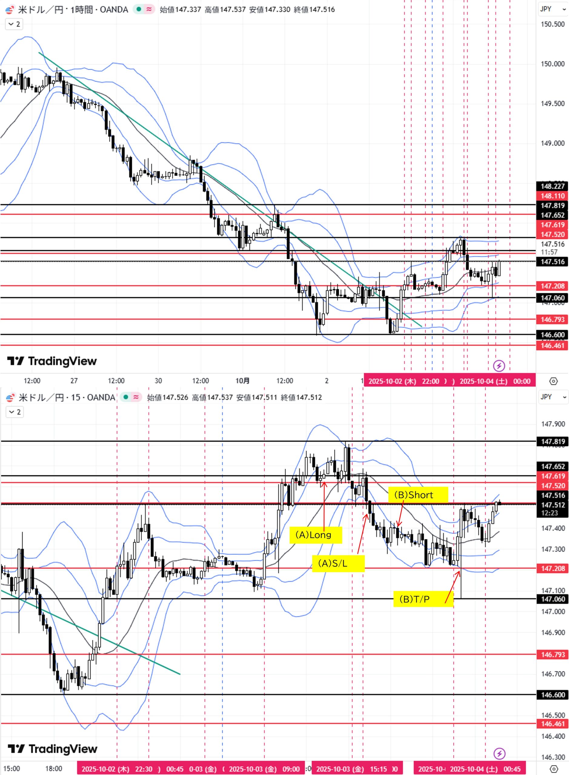 (B)日足押し安値147.619付近へ上昇→転換下落→目標1H足レンジ高値147.208