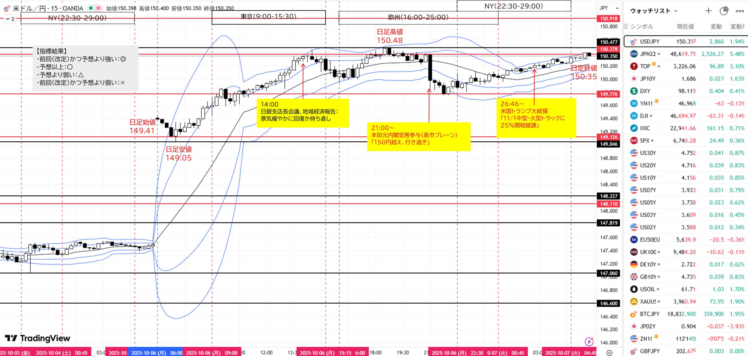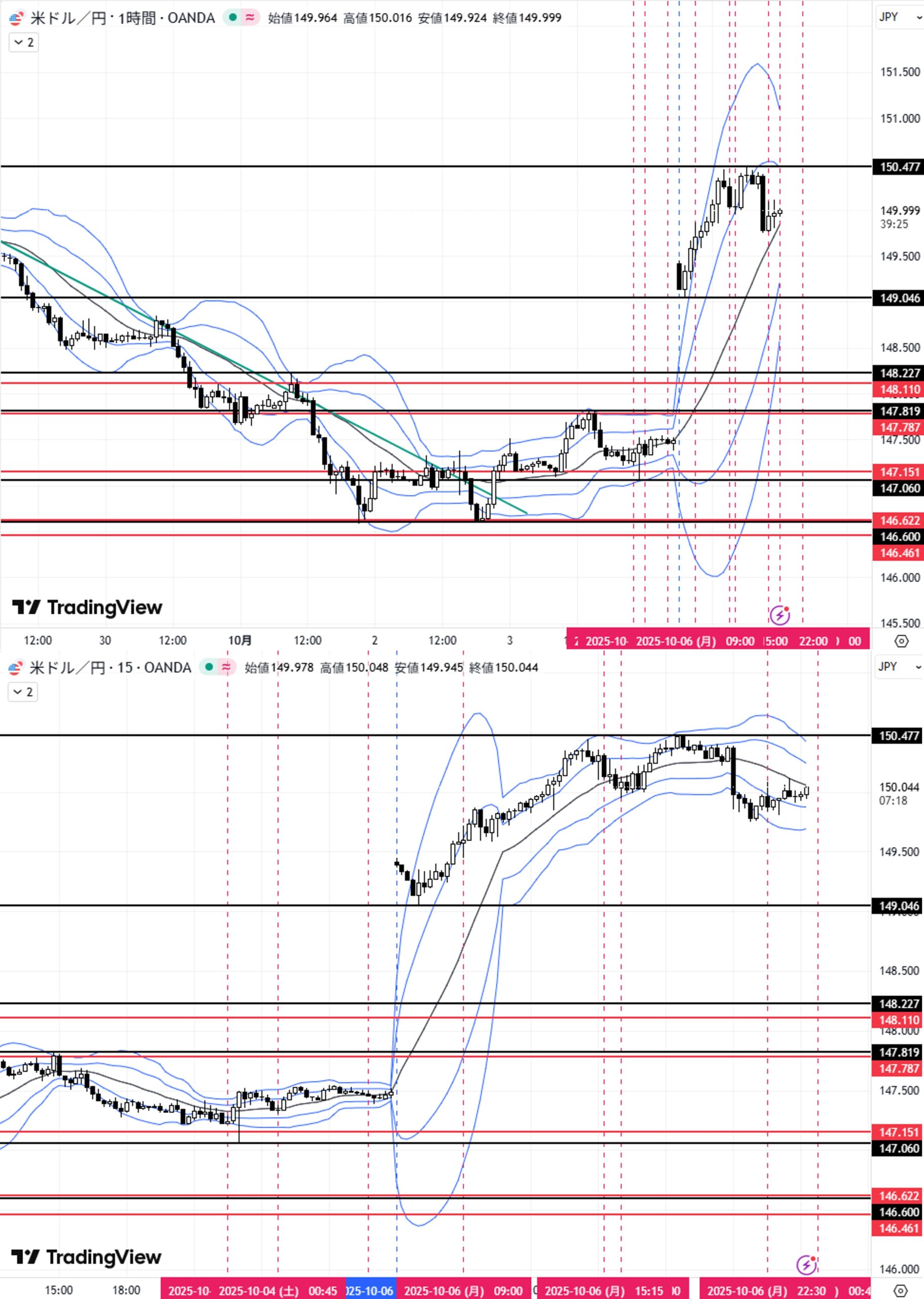 - 日足:10/3陽線。押し安値付近へレジサポ。ダウ転換シグナルの可能性。