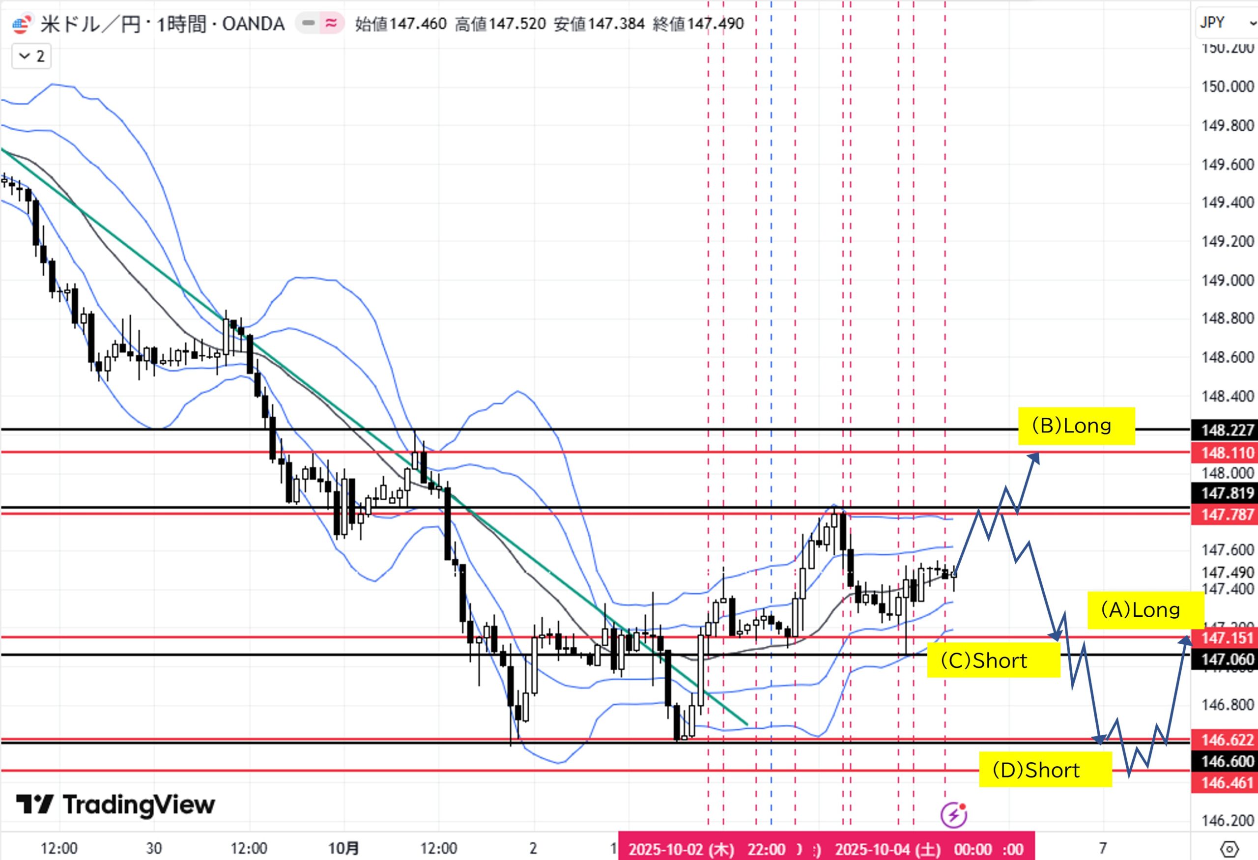 (C)1H足レンジ高値147.787付近へ上昇→転換下落→目標1H足押し安値147.151