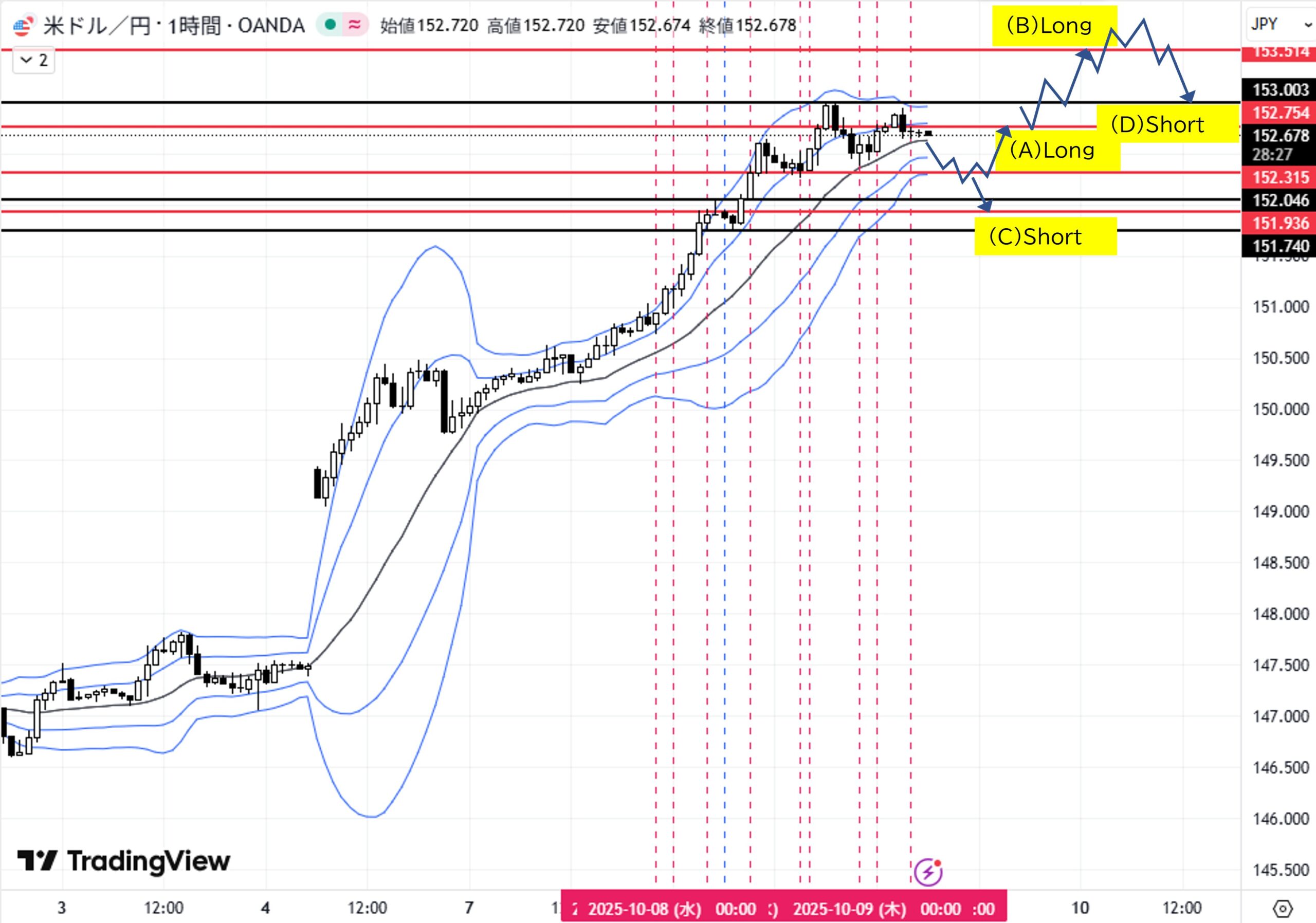 (A)1H足押し安値152.315付近へ下落→転換上昇→目標4H足ダウ高値152.754