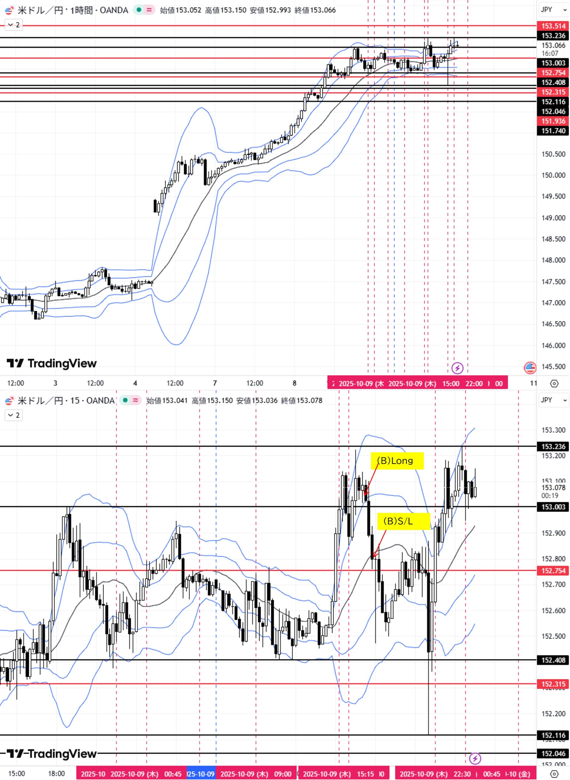 (B)日足高値153.003をダウ上昇→目標4H足押し安値153.514