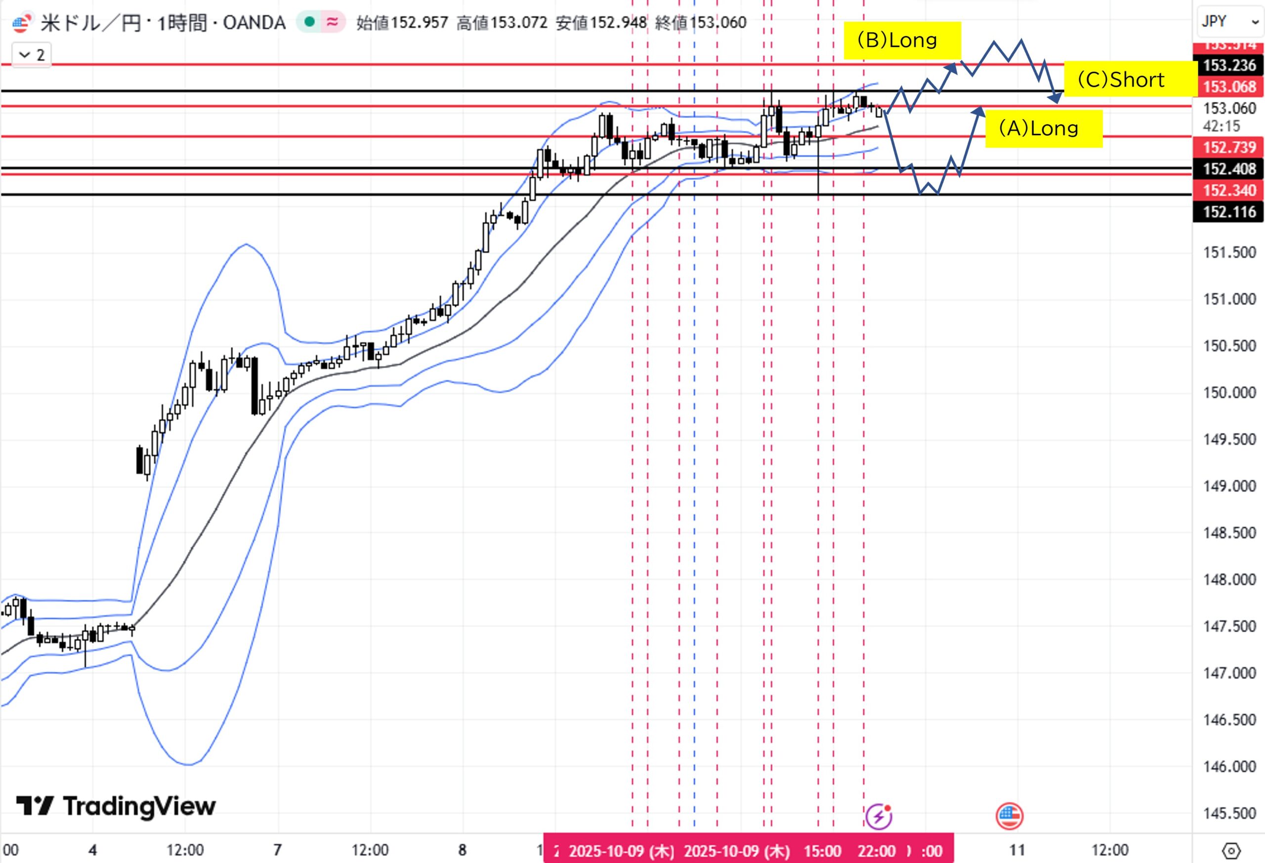 (C)4H足押し安値153.514付近へ上昇→転換下落→目標4H足レンジ高値153.068