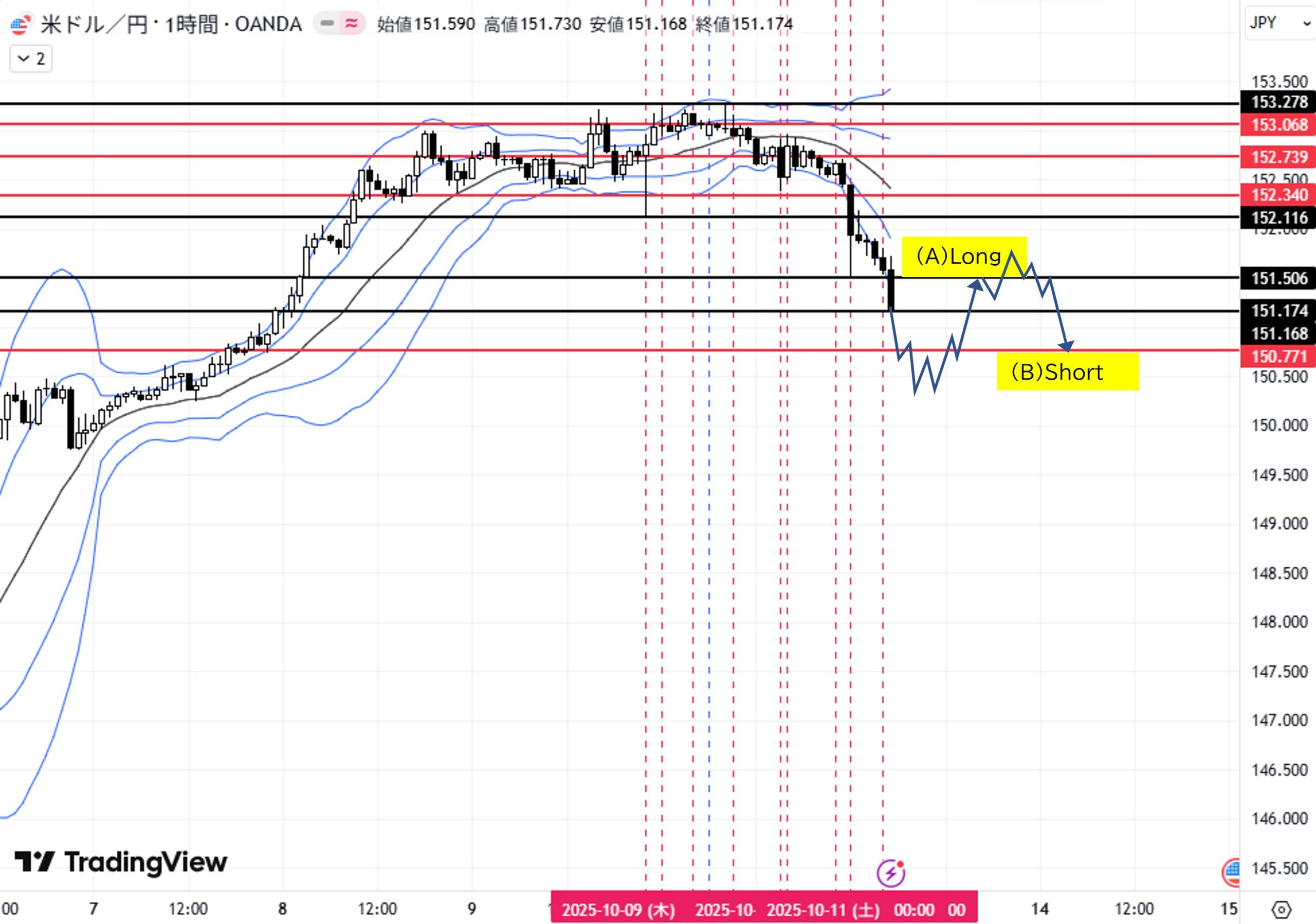 (B)1H足ダウ安値151.506付近へ上昇→転換下落→目標日足レンジ高値150.771