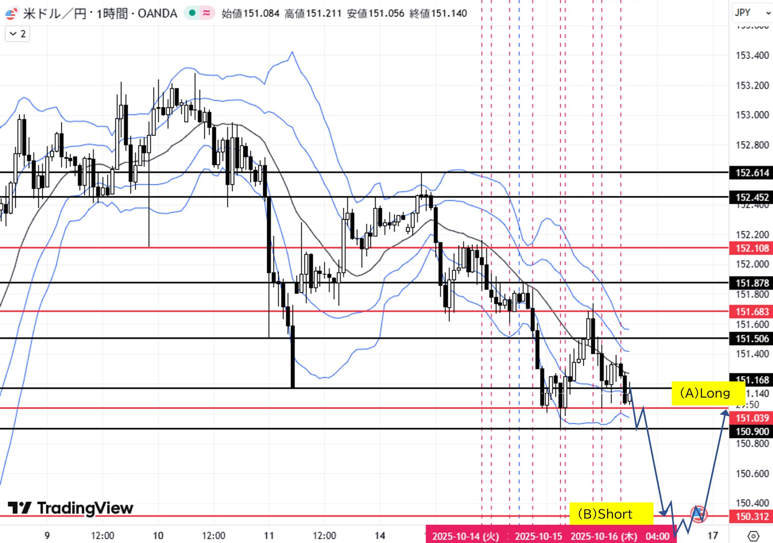 (A)日足押し安値150.312付近へ下落→転換上昇→目標1H足レンジ安値151.039