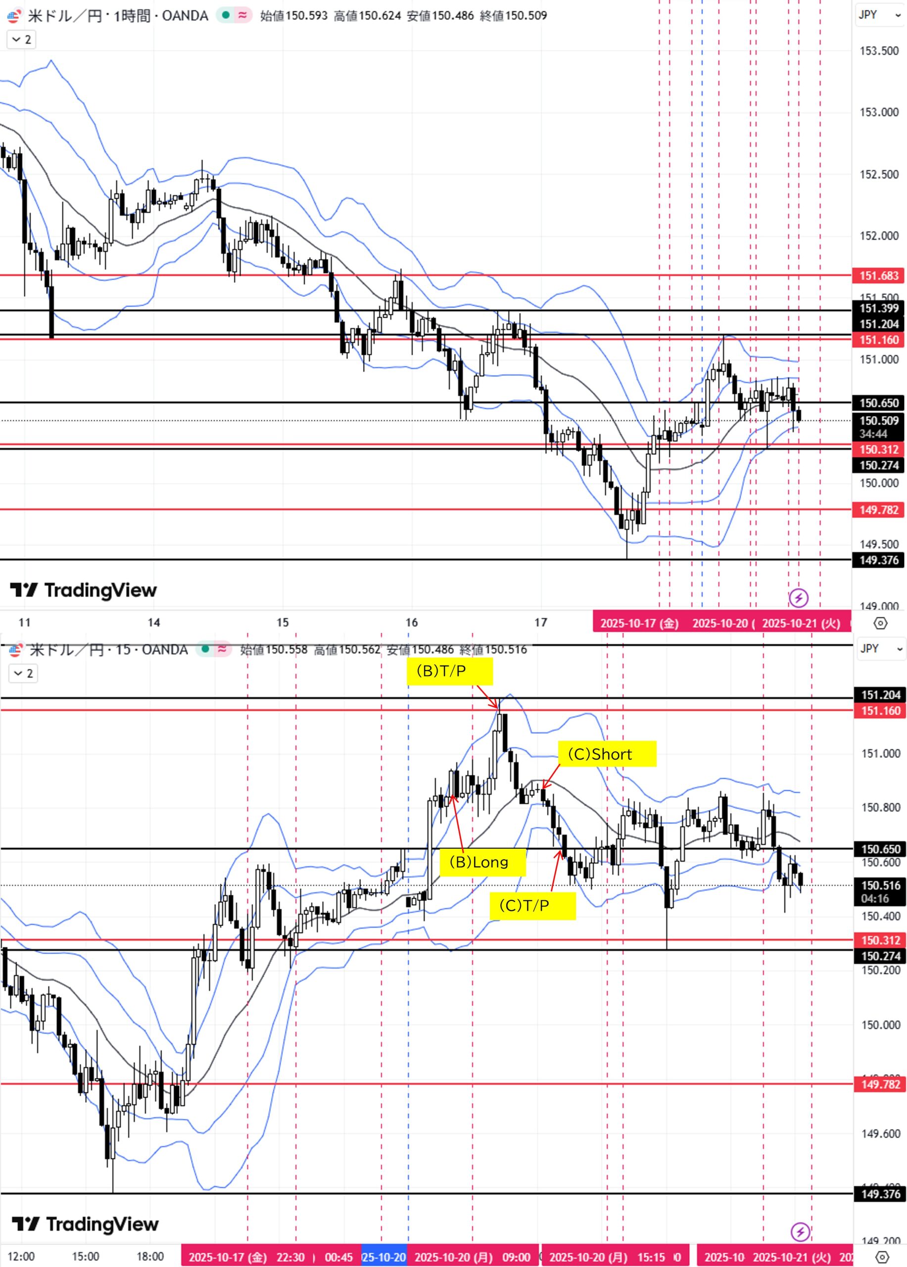 (B) (A)後、日足高値150.650をダウ上昇→目標4H足レンジ安値151.160