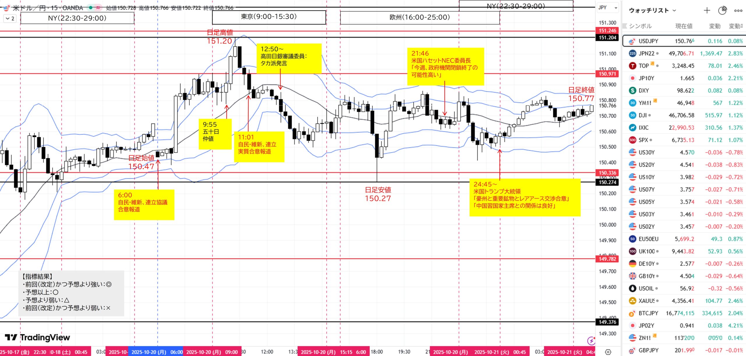 - 日足:10/17下ヒゲピンバー陽線。レンジ。20MA付近