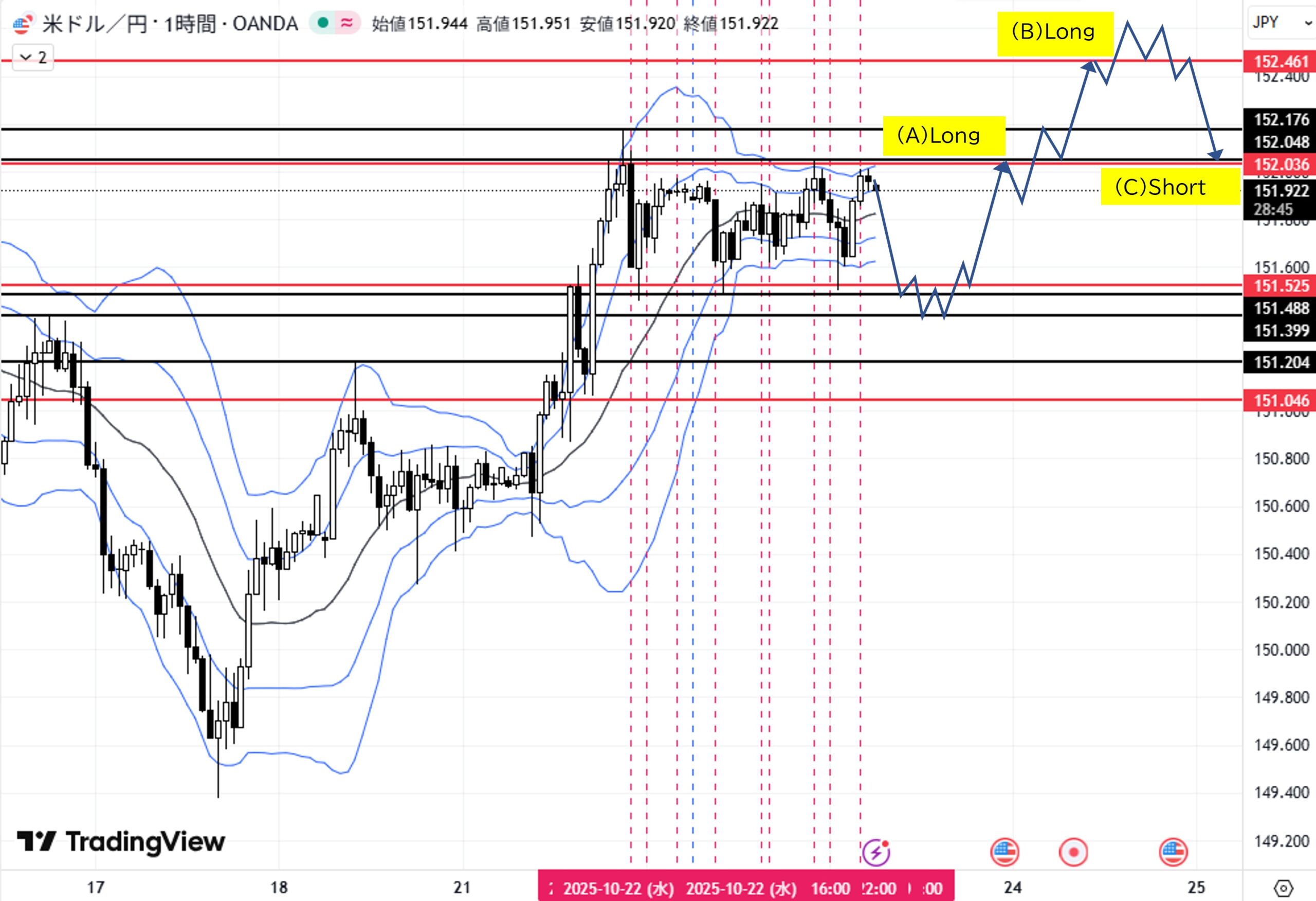 (A)1H足レンジ安値151.525付近へ下落→転換上昇→目標1H足レンジ高値152.036