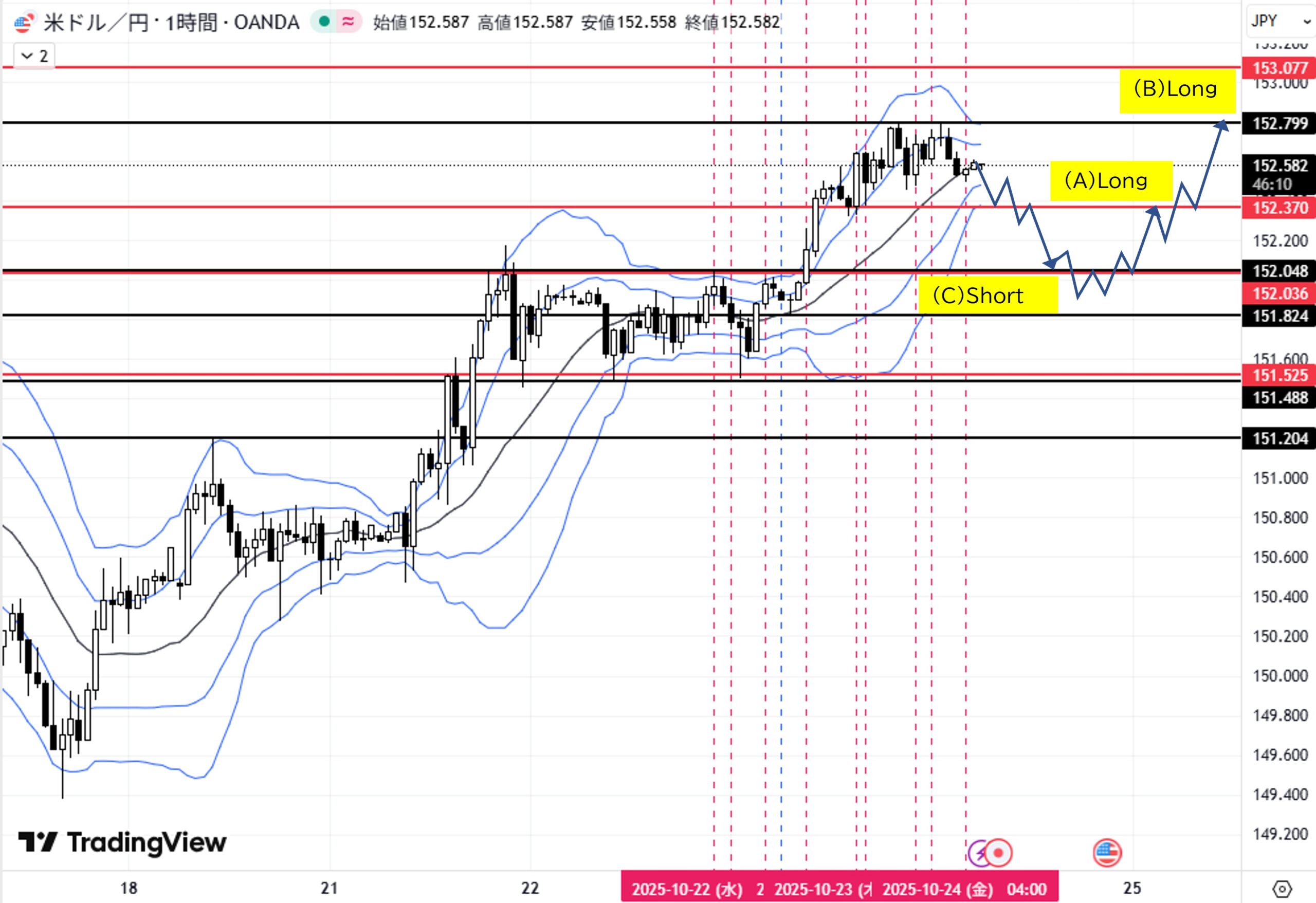 (B) (A)後、1H足押し安値152.370をダウ上昇→目標日足高値152.799