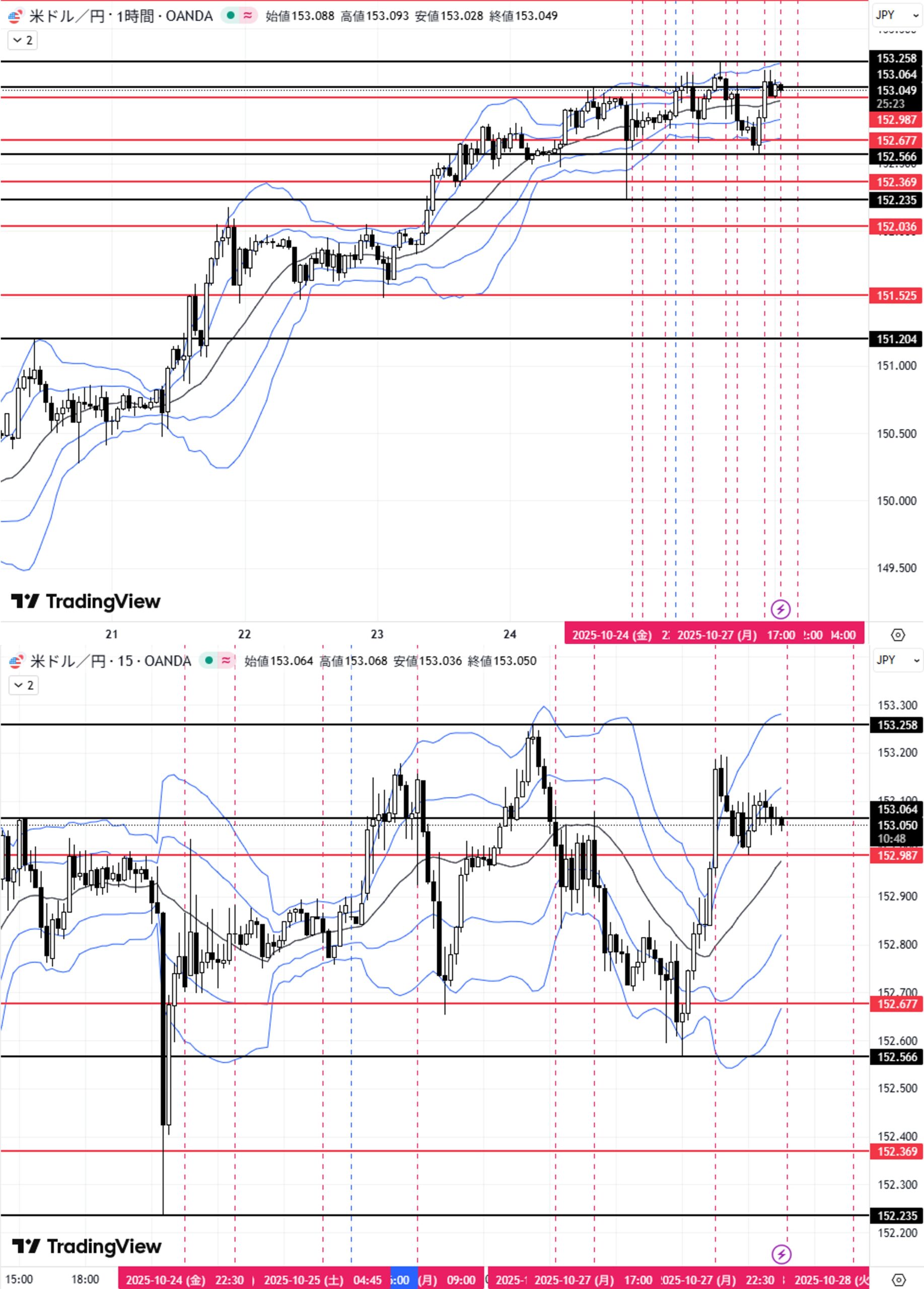 - 日足:10/24陽線。レンジ。BB+1σ付近
