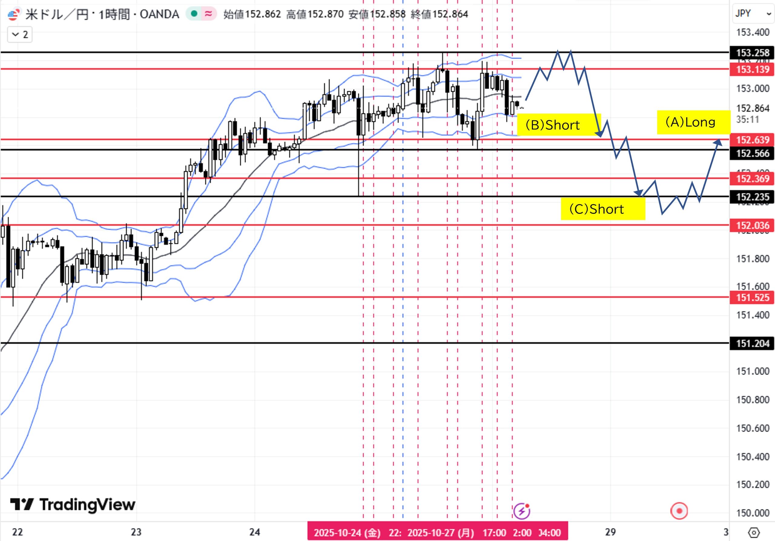 (B)日足高値153.258付近へ上昇→転換下落→目標1H足レンジ安値152.639