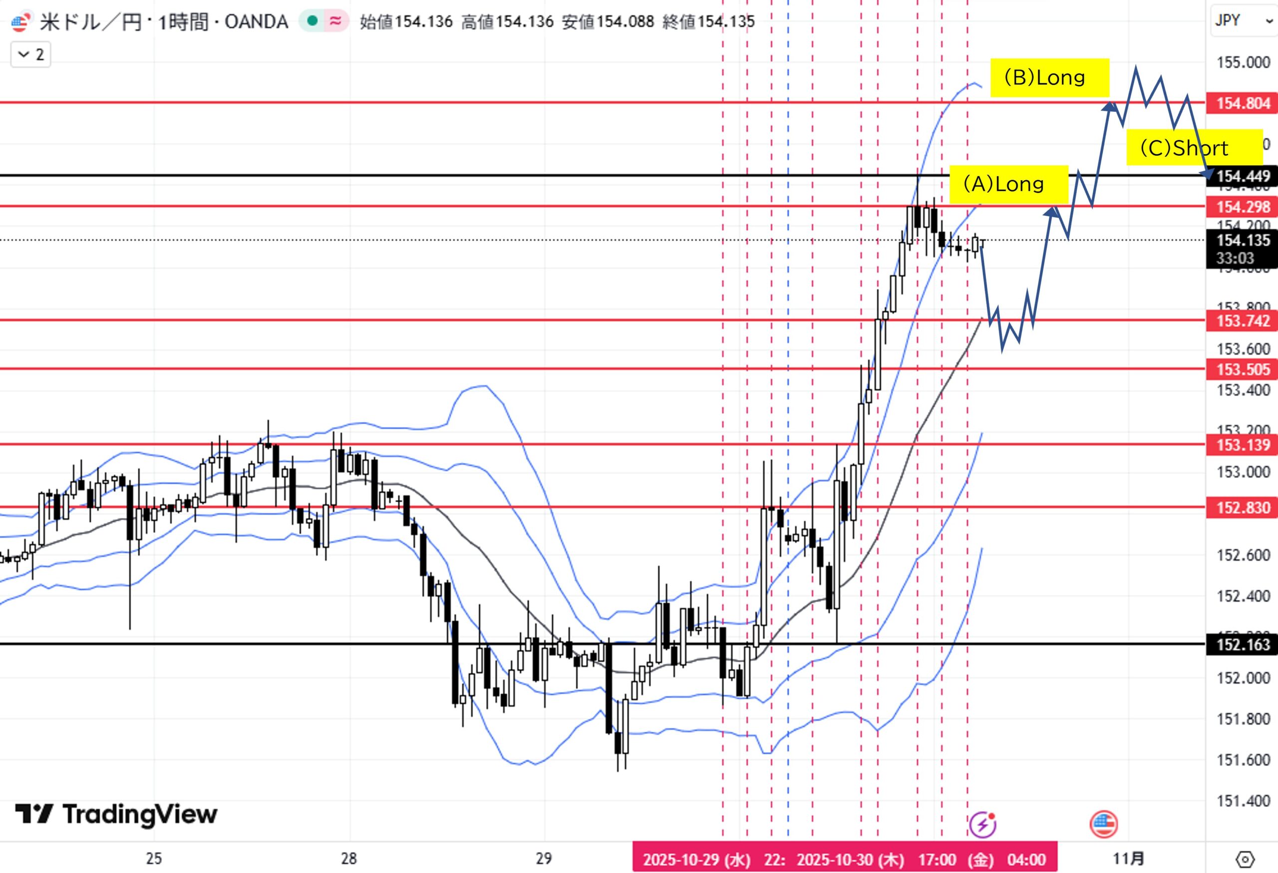 (A)1H足押し安値153.742付近へ下落→転換上昇→目標1H足ダウ高値154.298