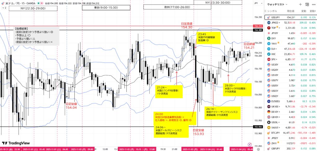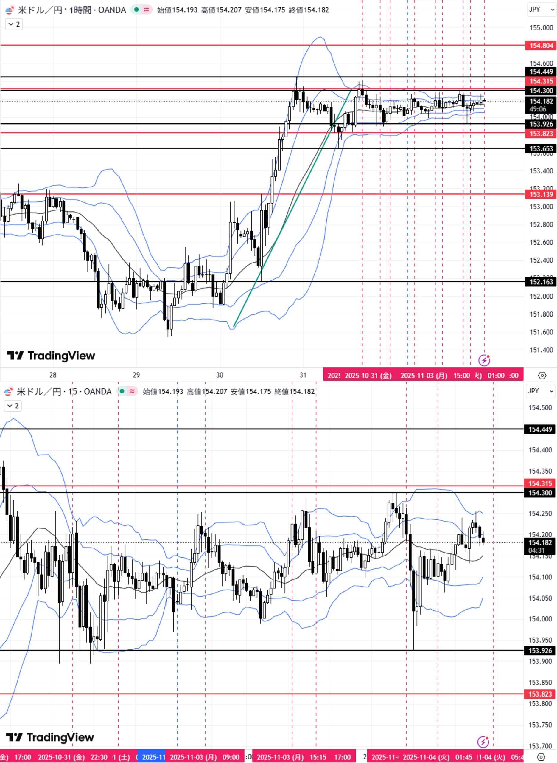 - 日足:10/31陰線コマ足。上昇トレンド。戻り高値かつBB+2σ付近