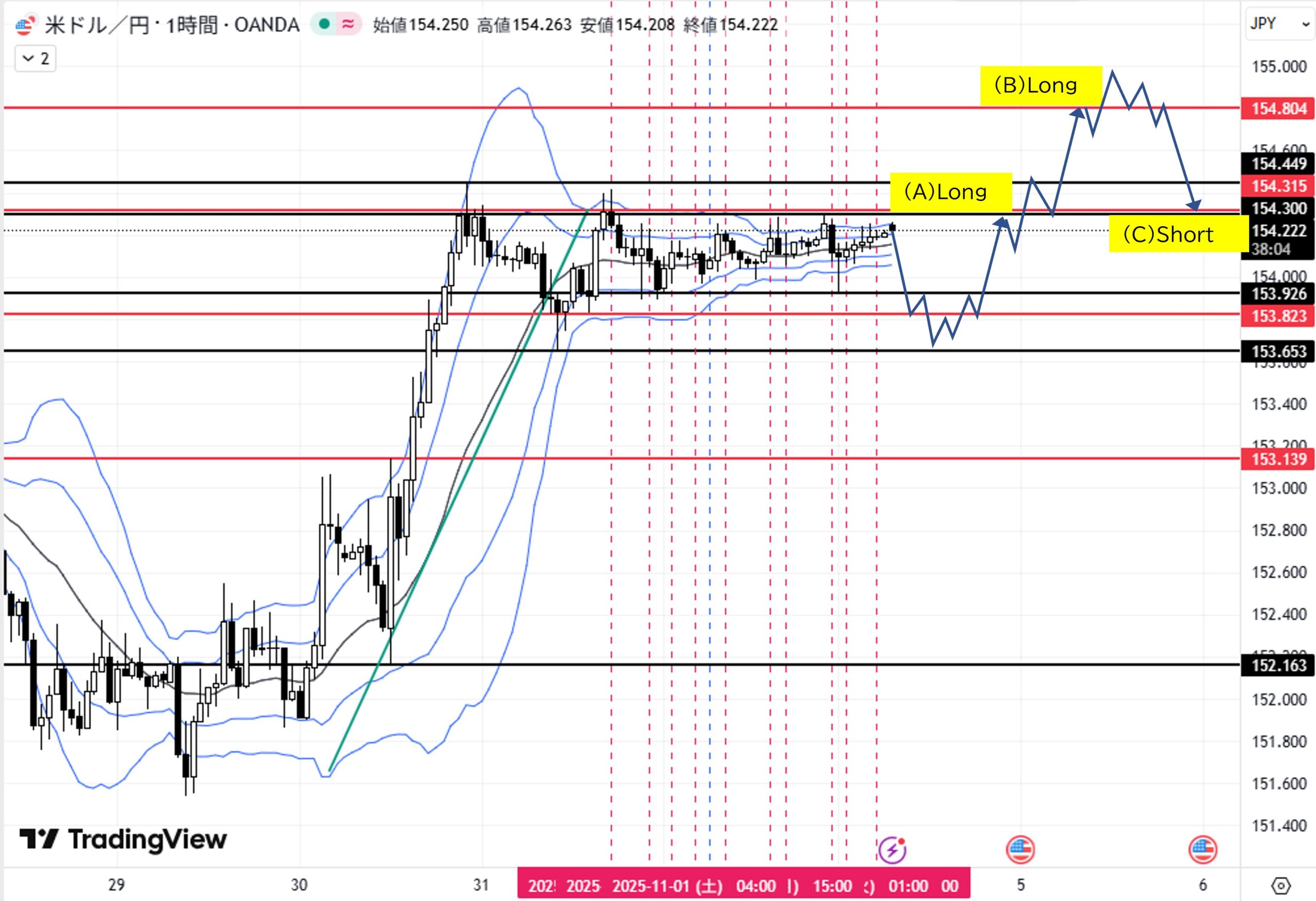 (A)1H足レンジ高値153.823付近へ下落→転換上昇→目標1H足レンジ高値154.315