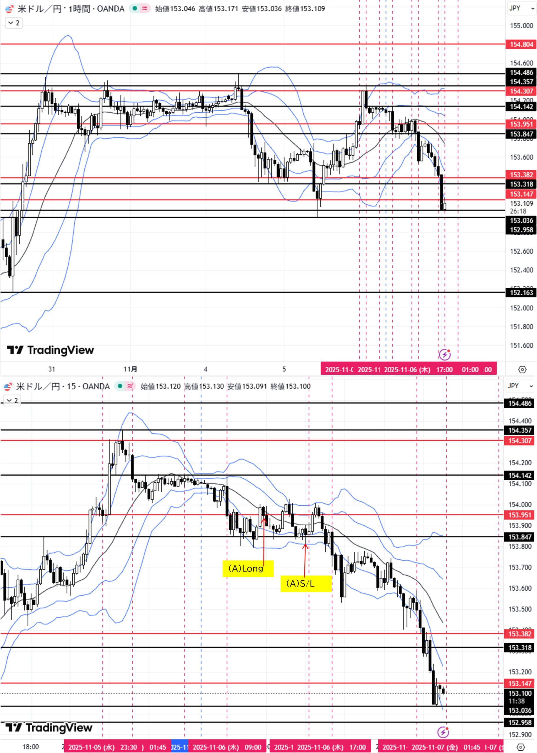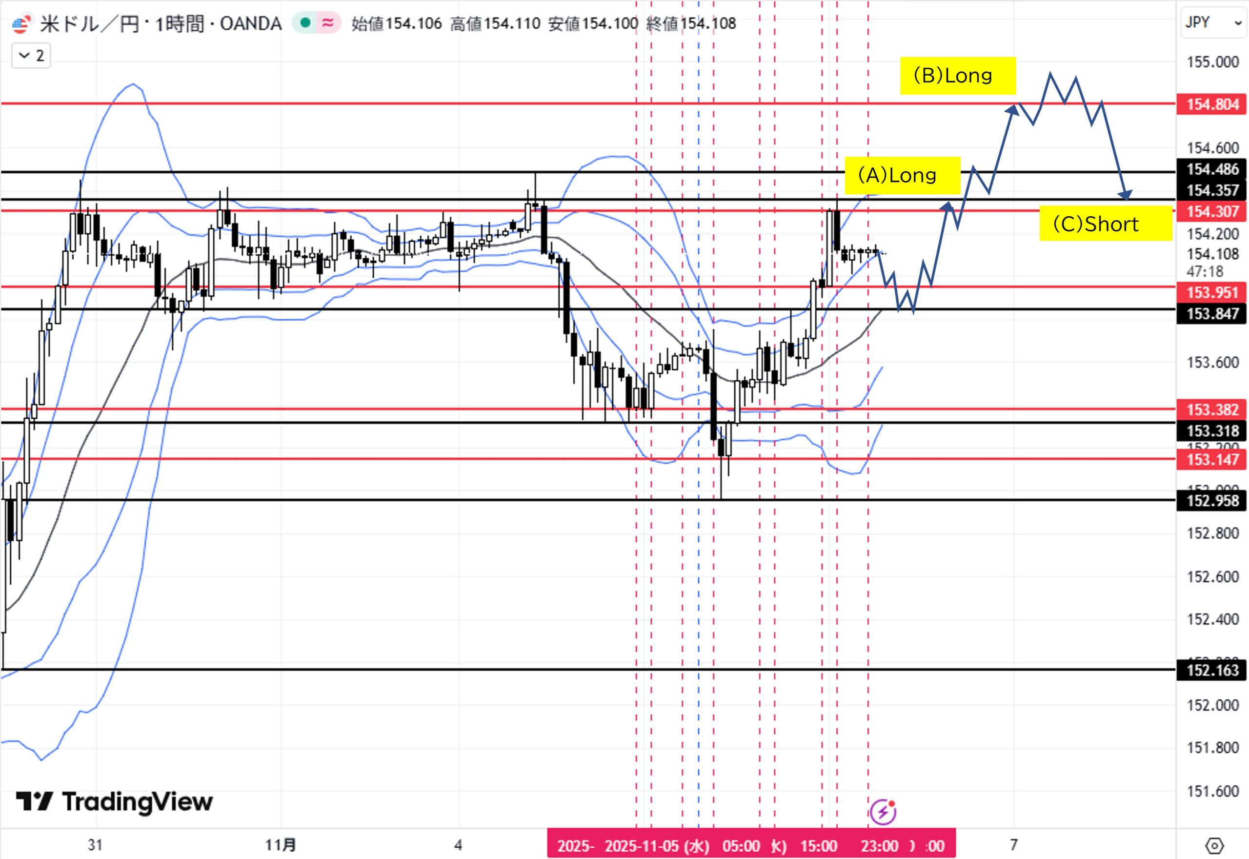 (A)1H足押し安値153.951付近へ下落→転換上昇→目標日足高値154.357