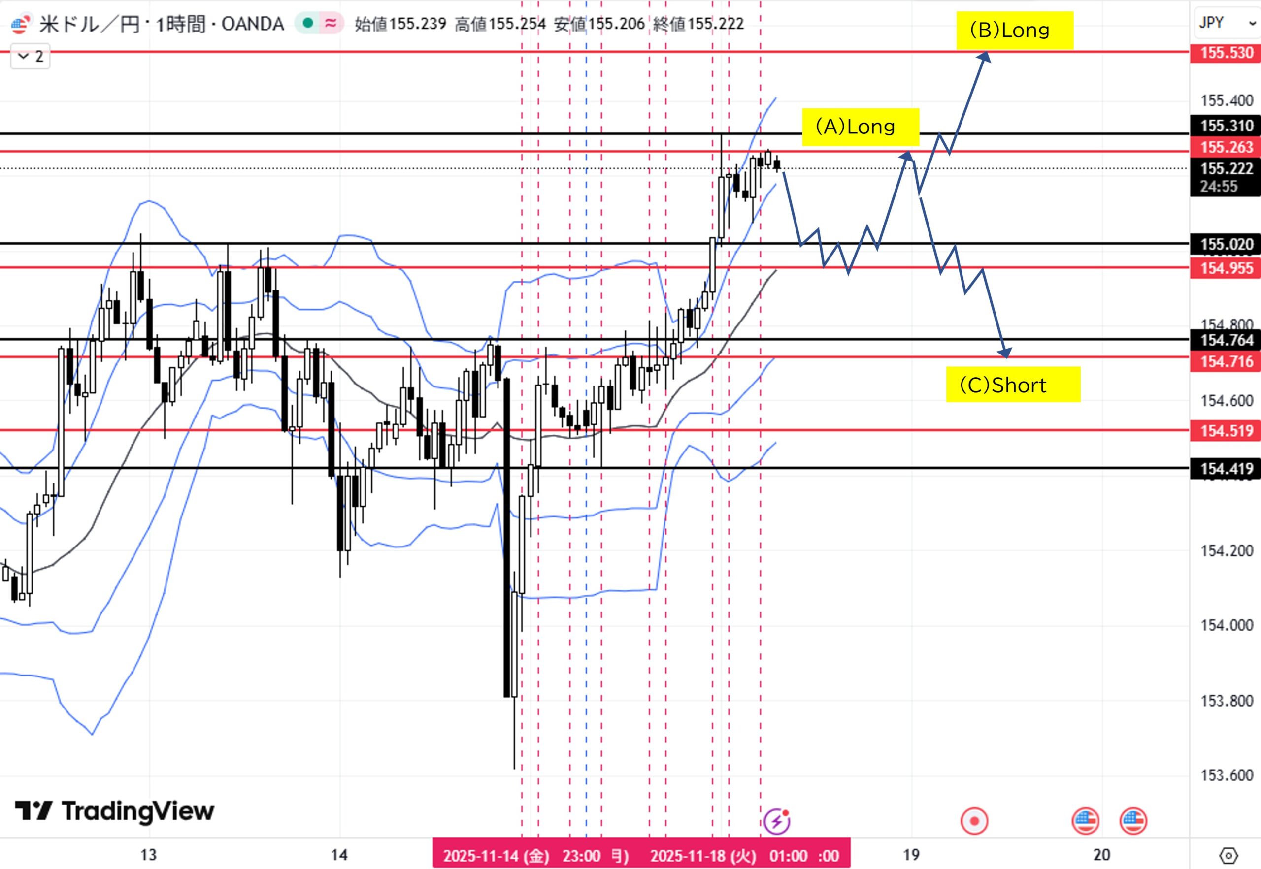 (C) (A)後、4H足レンジ高値154.955をダウ下落→目標1H足押し安値154.716