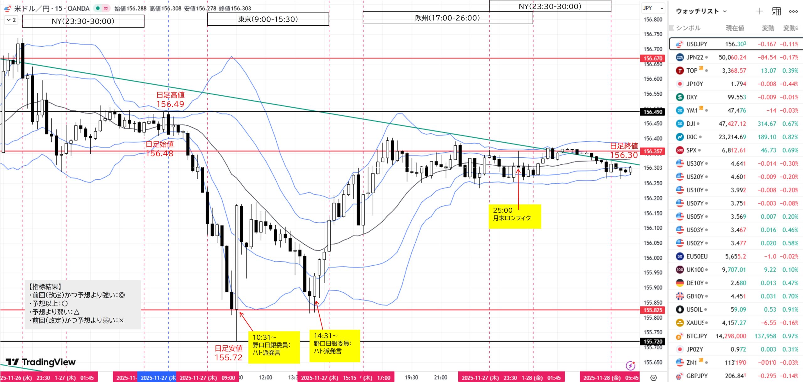 - 日足:11/26陽線。上昇トレンド。BB+1σ付近