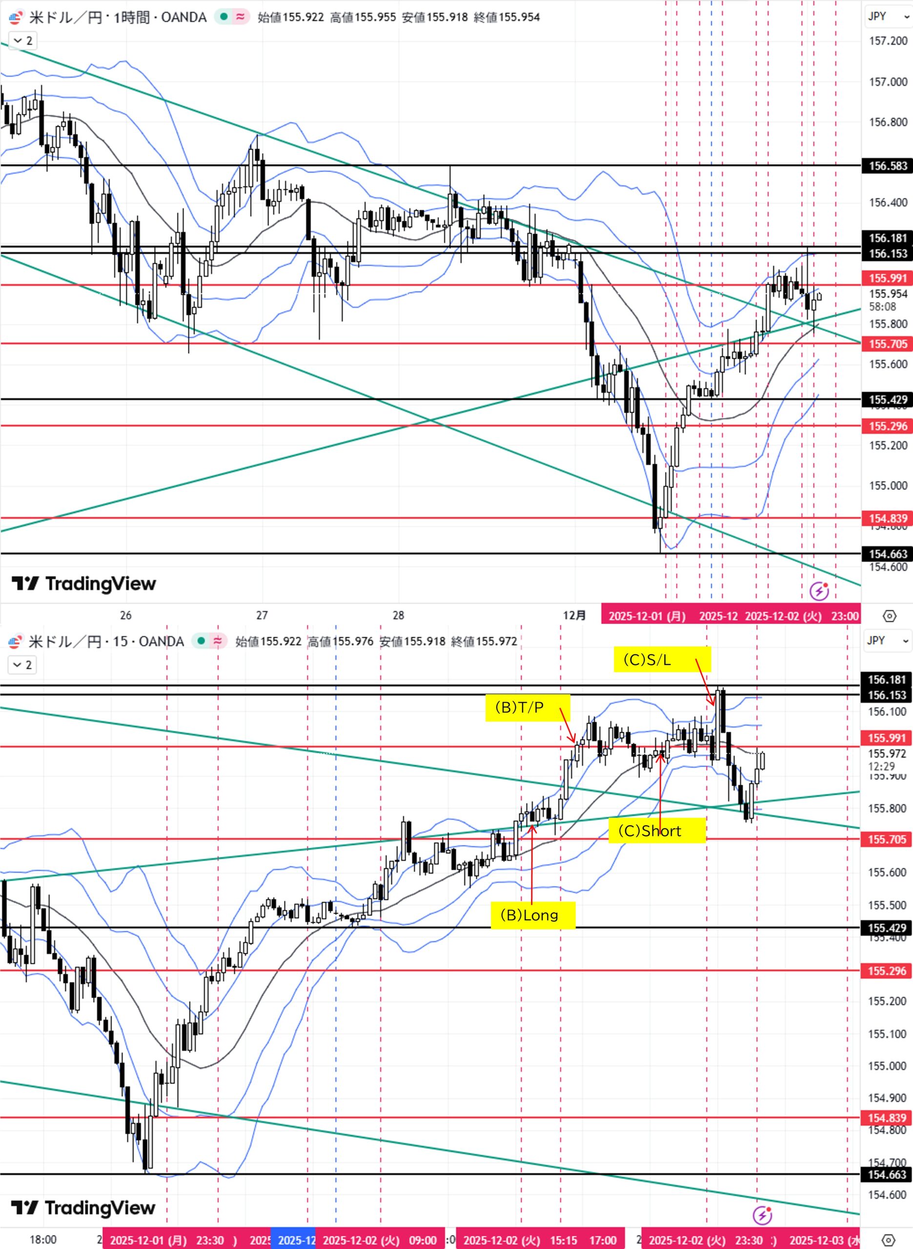 (B)1H足戻り高値155.705をダウ上昇→目標日足ダウ安値155.991
