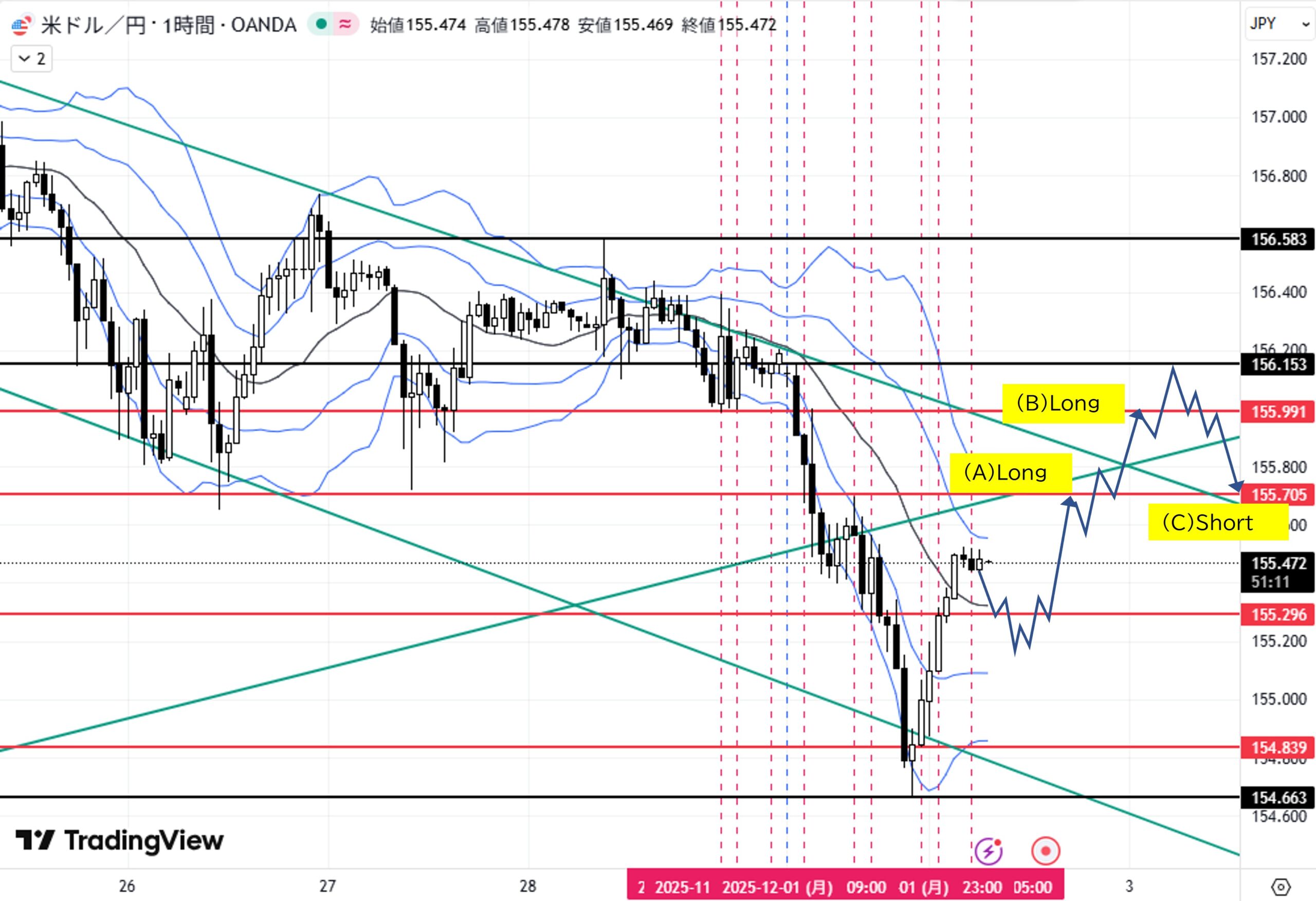 (A)1H足三尊肩155.296付近へ下落→転換上昇→目標1H足戻り高値155.705