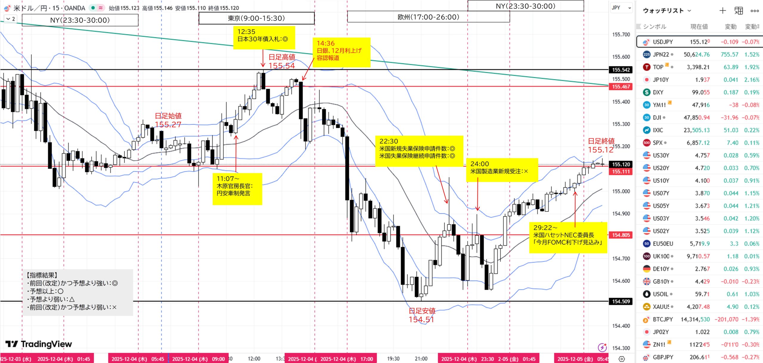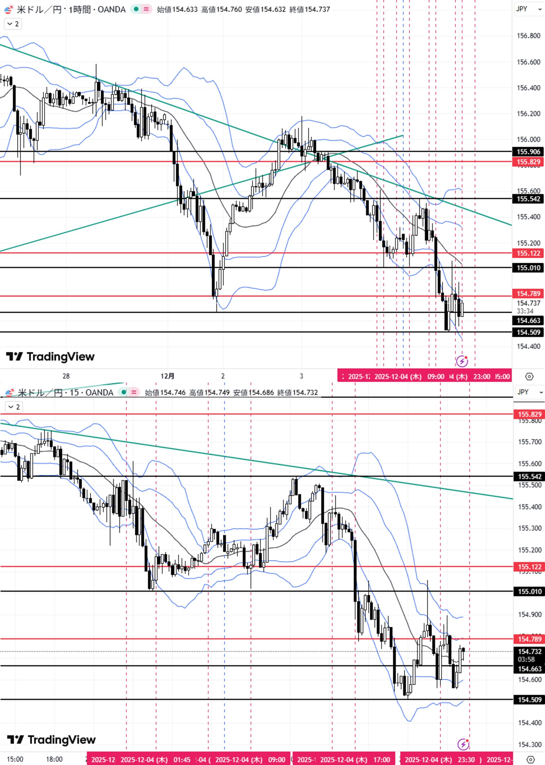 (B)1H足ダウ安値155.122をダウ下落→目標1H足押し安値154.789