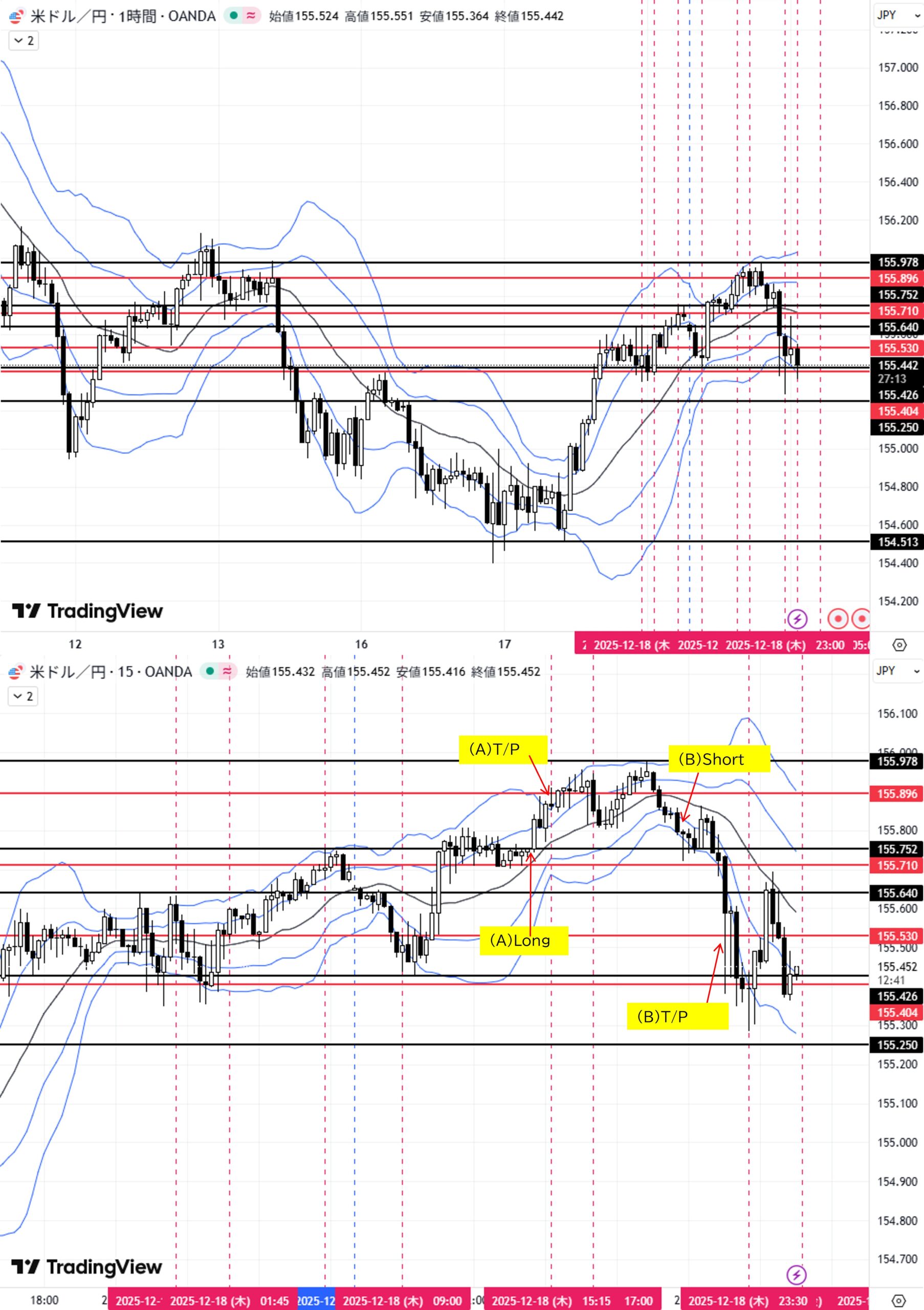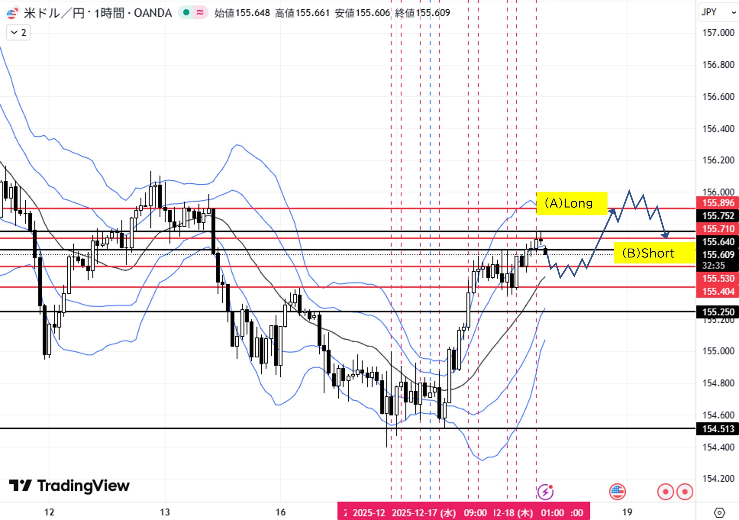 (B)日足戻り高値155.896付近へ上昇→転換下落→目標1H足押し安値155.530
