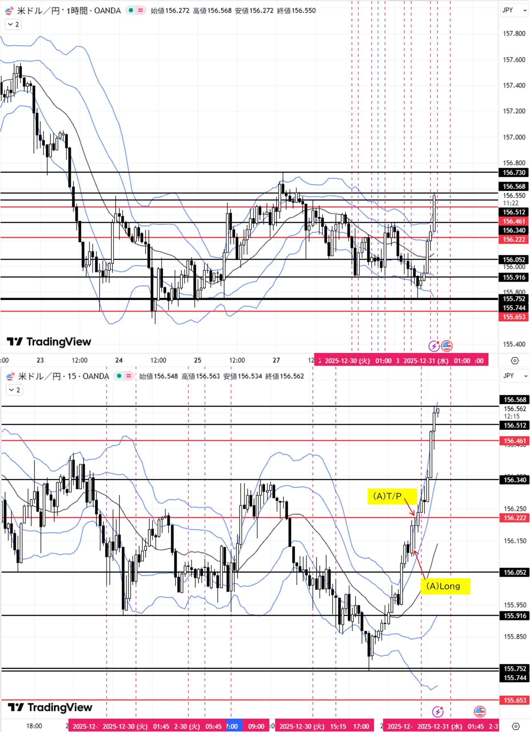 (A)日足安値155.916付近へ下落→転換上昇→目標1H足戻り高値156.222
