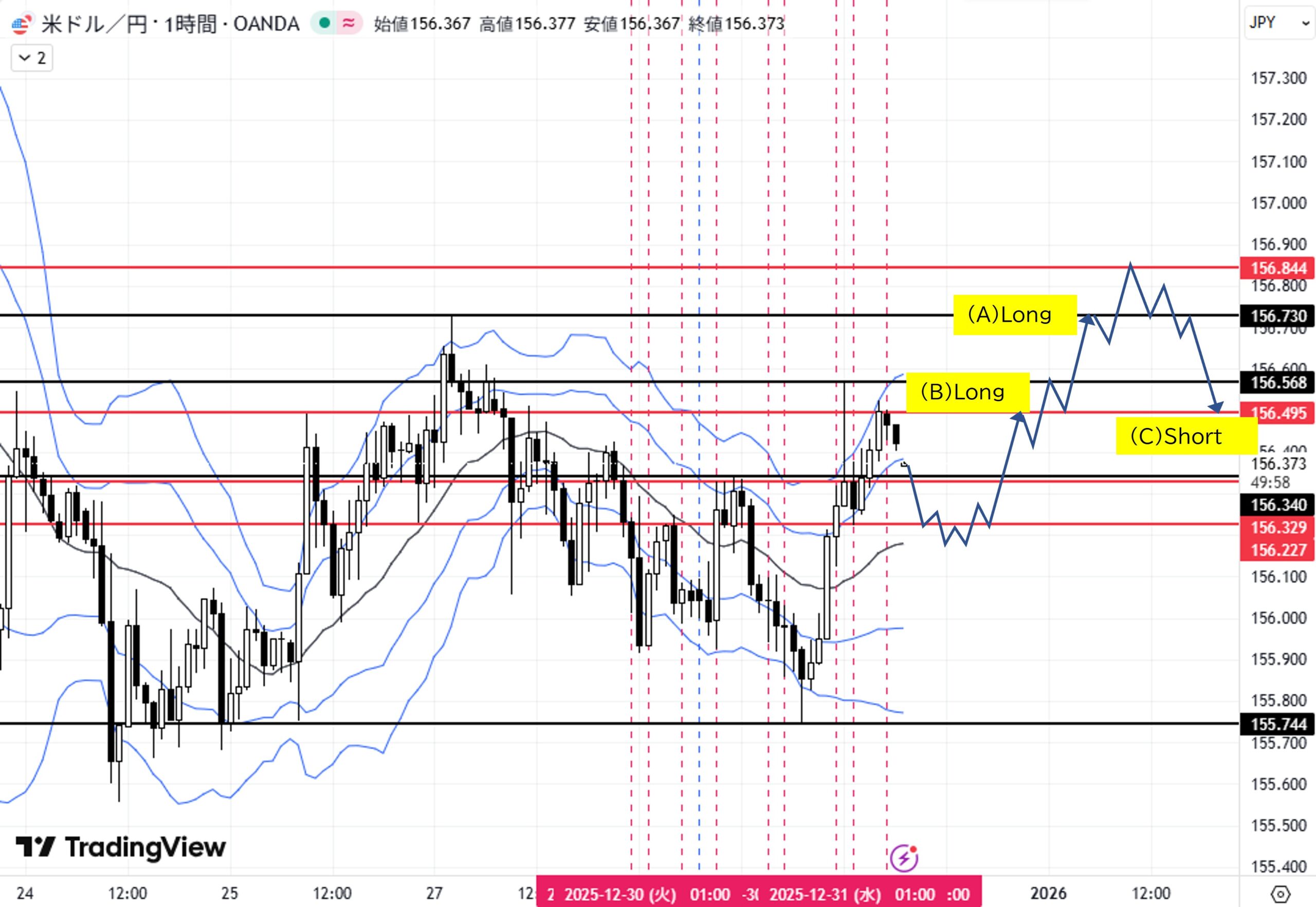 (C)1H足レンジ高値156.730付近へ上昇→転換下落→目標1H足ダウ高値156.495