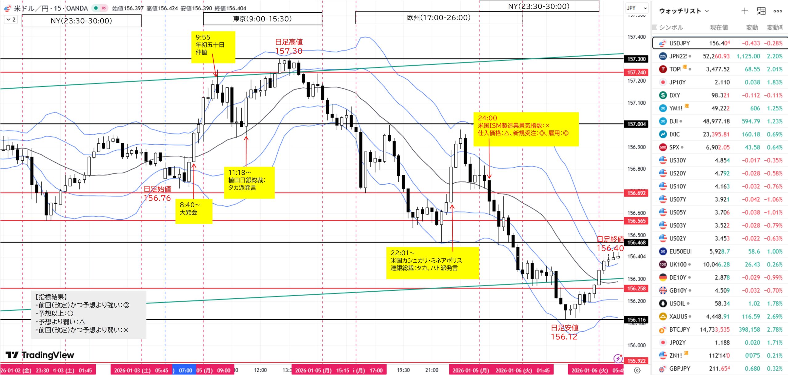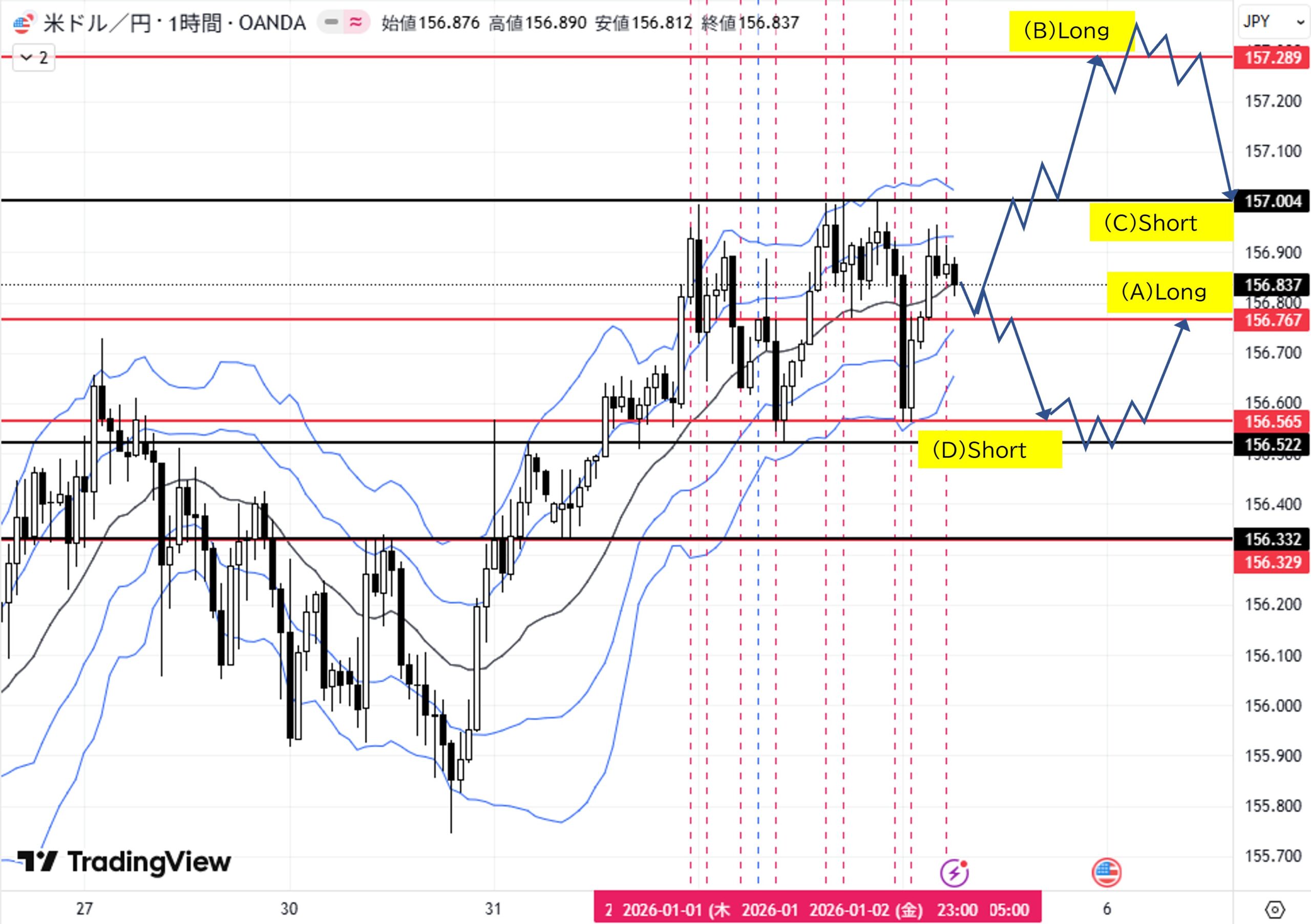 (B)日足高値157.004をダウ上昇→目標1H足レンジ安値157.289
