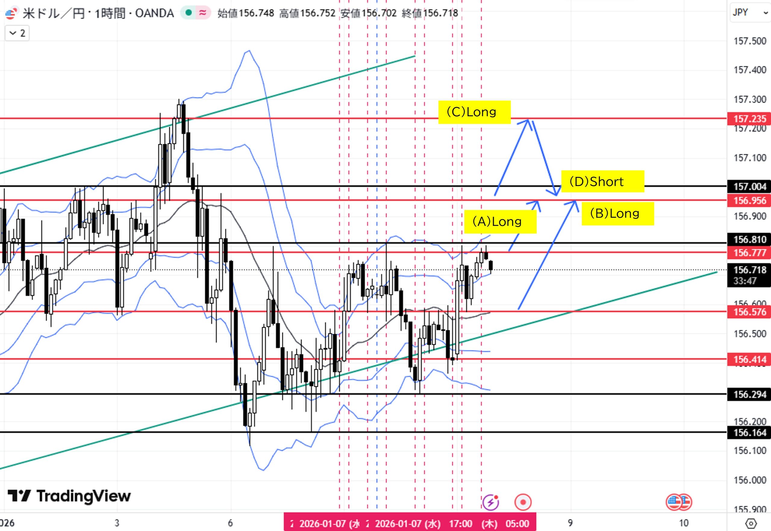 (D)4H足レンジ高値157.235付近へ上昇→転換下落→目標4H足三尊右肩156.956