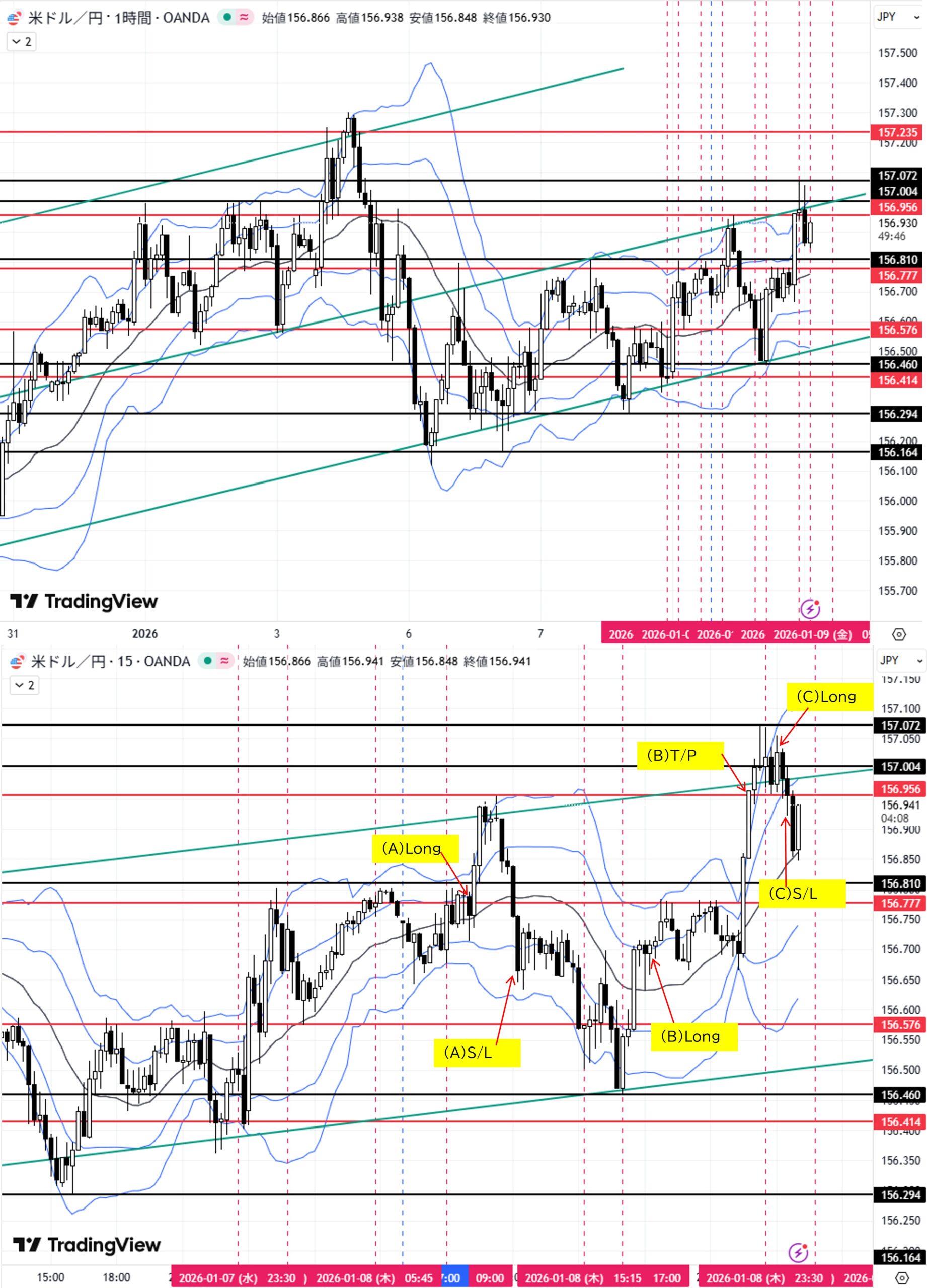 (B)1H足押し安値156.576付近へ下落→転換上昇→目標4H足三尊右肩156.956