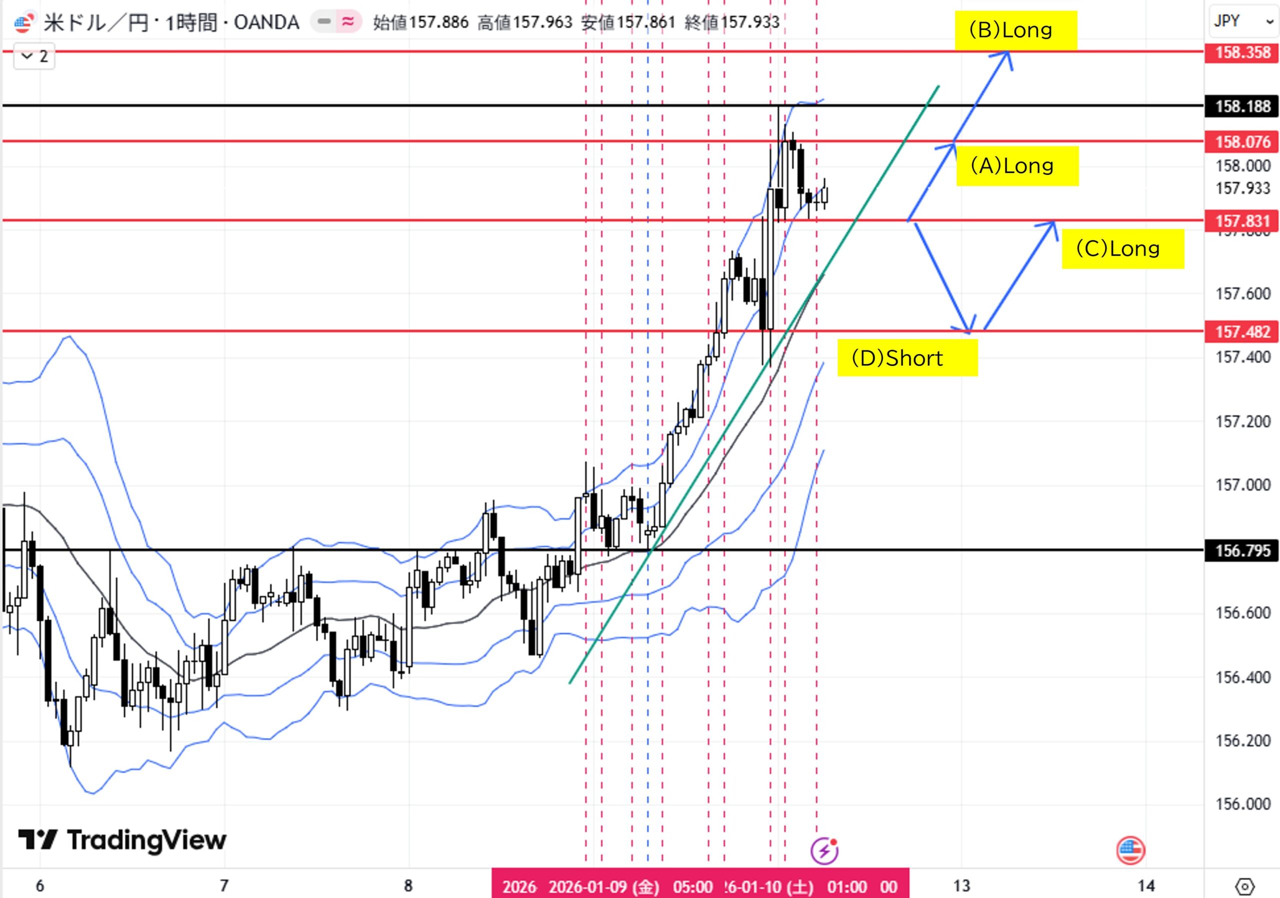 (B)1H足ダウ高値158.076をダウ上昇→目標日足レンジ高値158.358