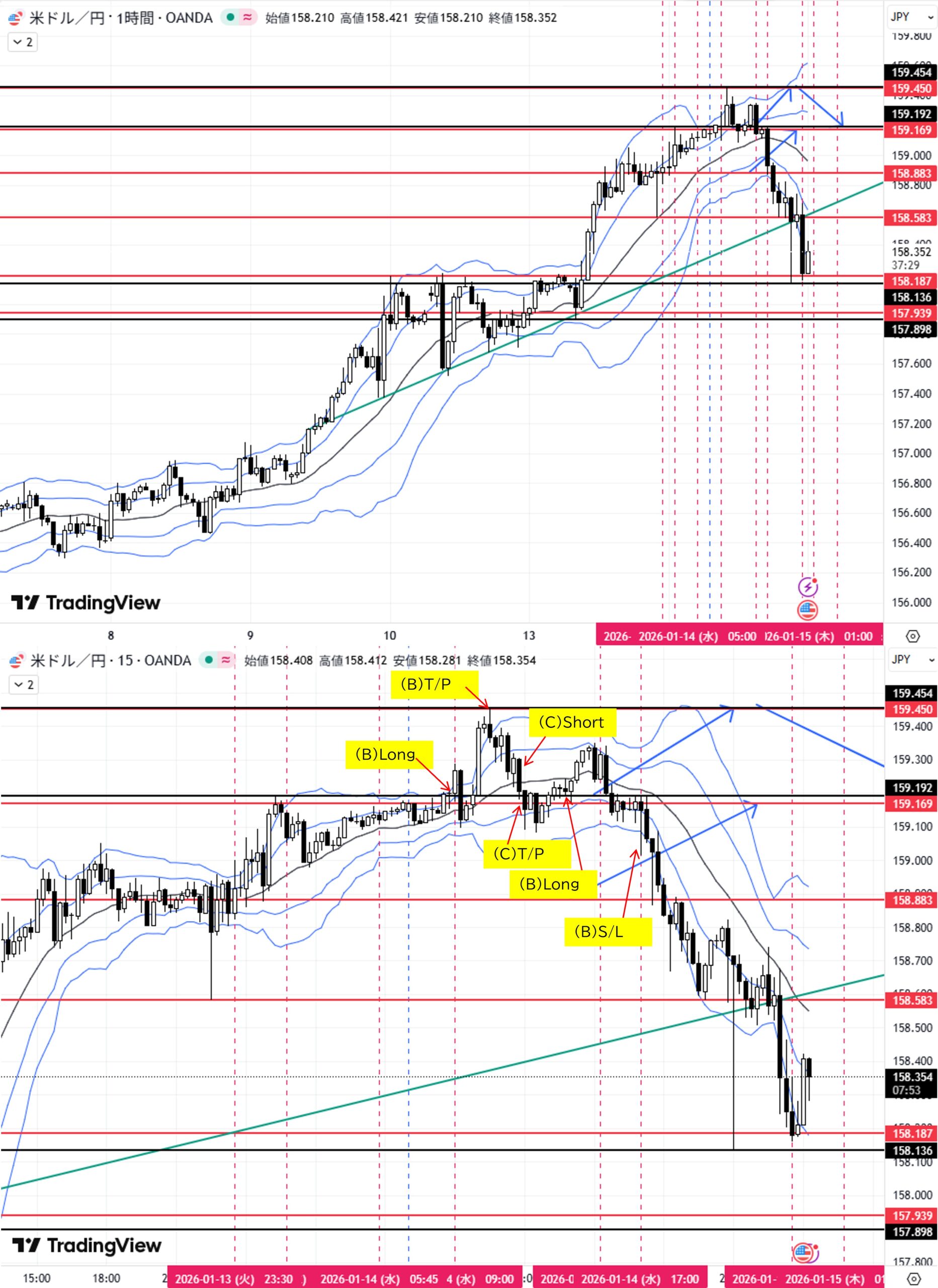 (C)日足戻り高値ヒゲ先159.450付近へ上昇→転換下落→目標1H足レンジ高値159.169