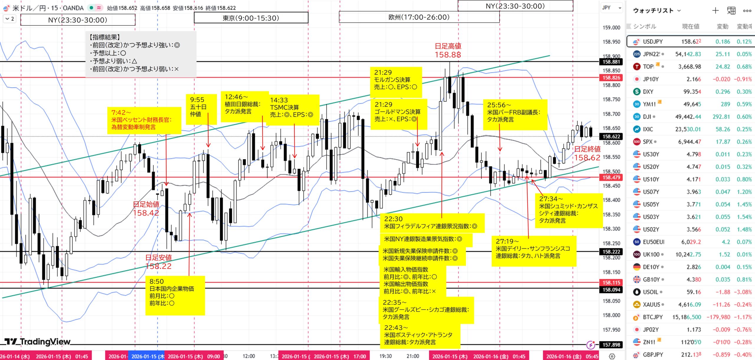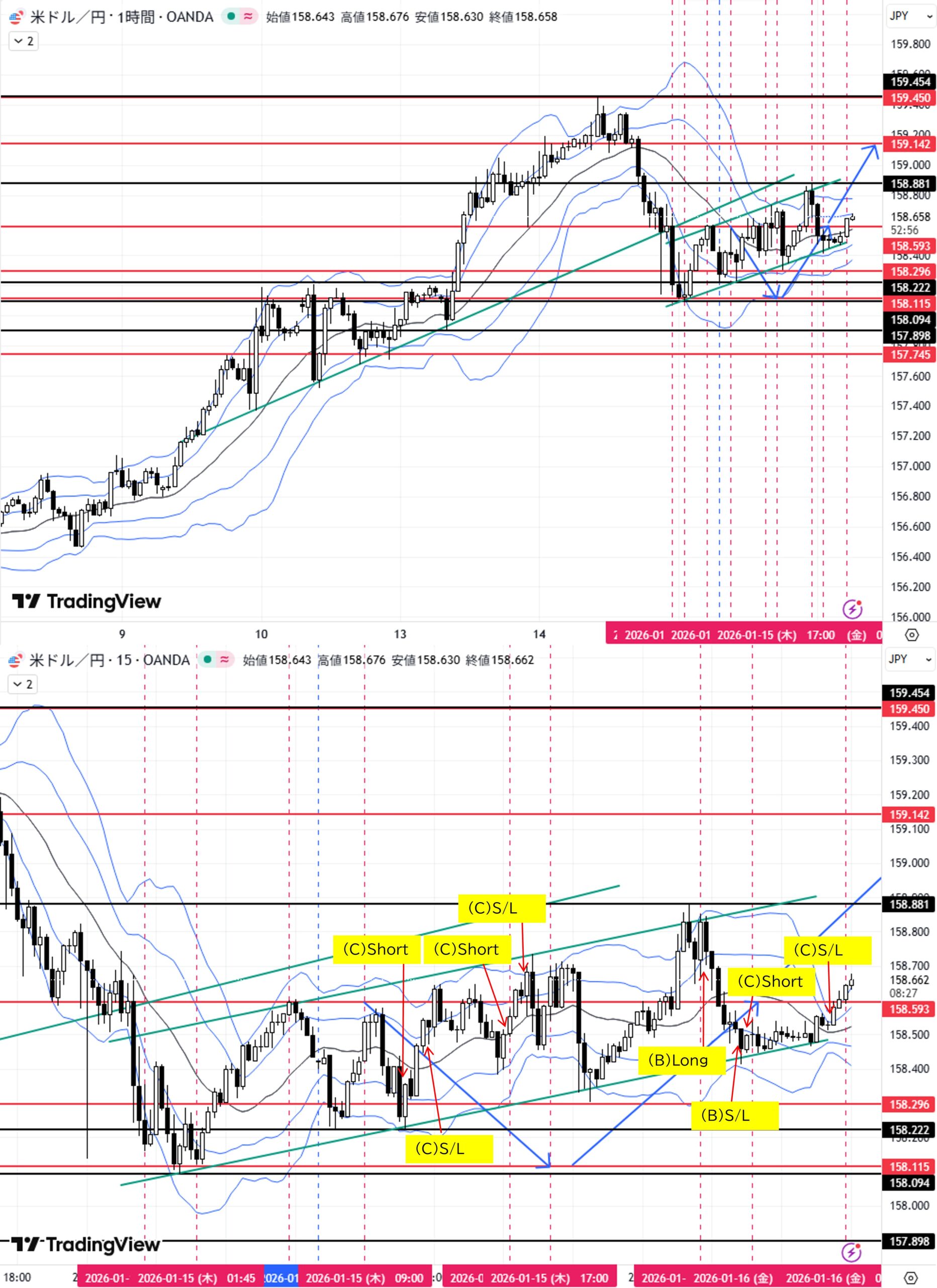 (C)1H足レンジ高値158.593付近へ上昇→転換下落→目標1H足レンジ安値158.115