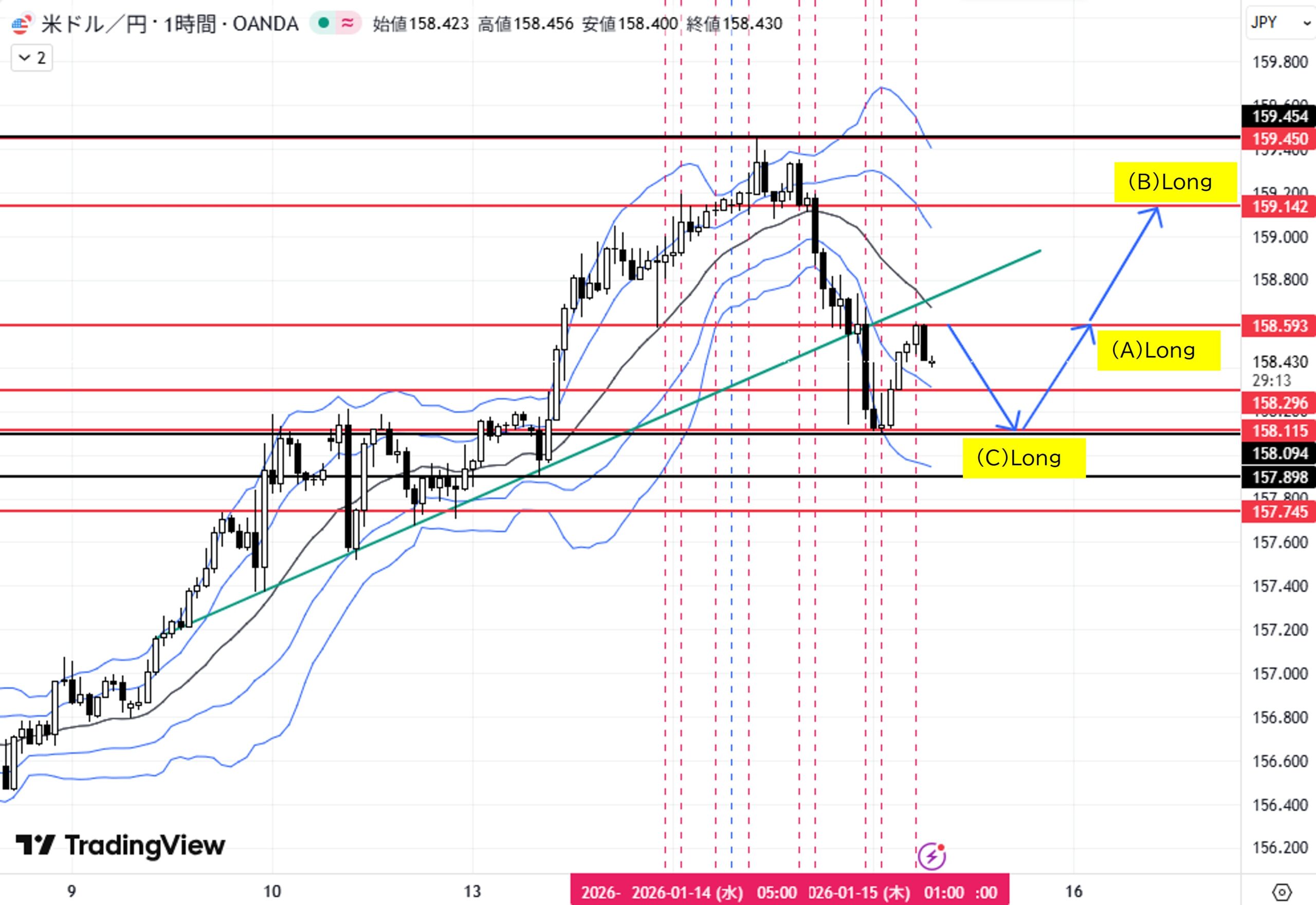 (A)1H足レンジ安値158.115付近へ下落→転換上昇→目標1H足レンジ高値158.593