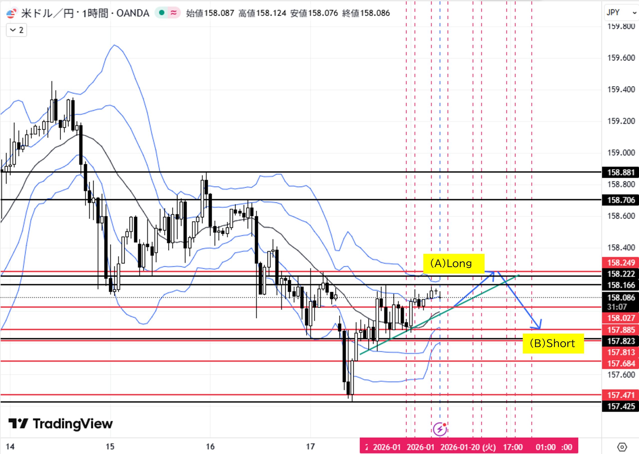 (A)1H足押し安値158.027付近へ下落→転換上昇→目標1H足戻り高値158.249