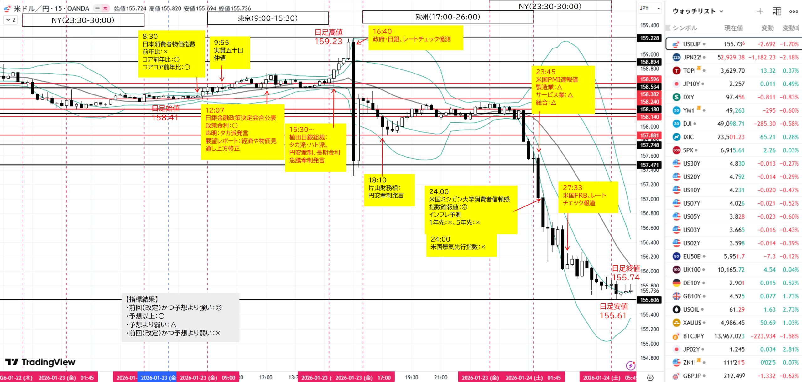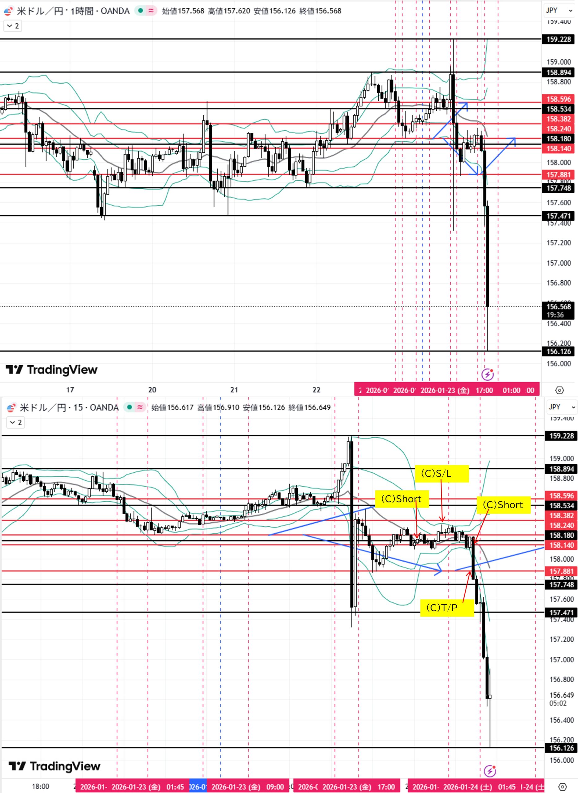 (C)1H足押し安値158.240をダウ下落→目標4H足押し安値157.881