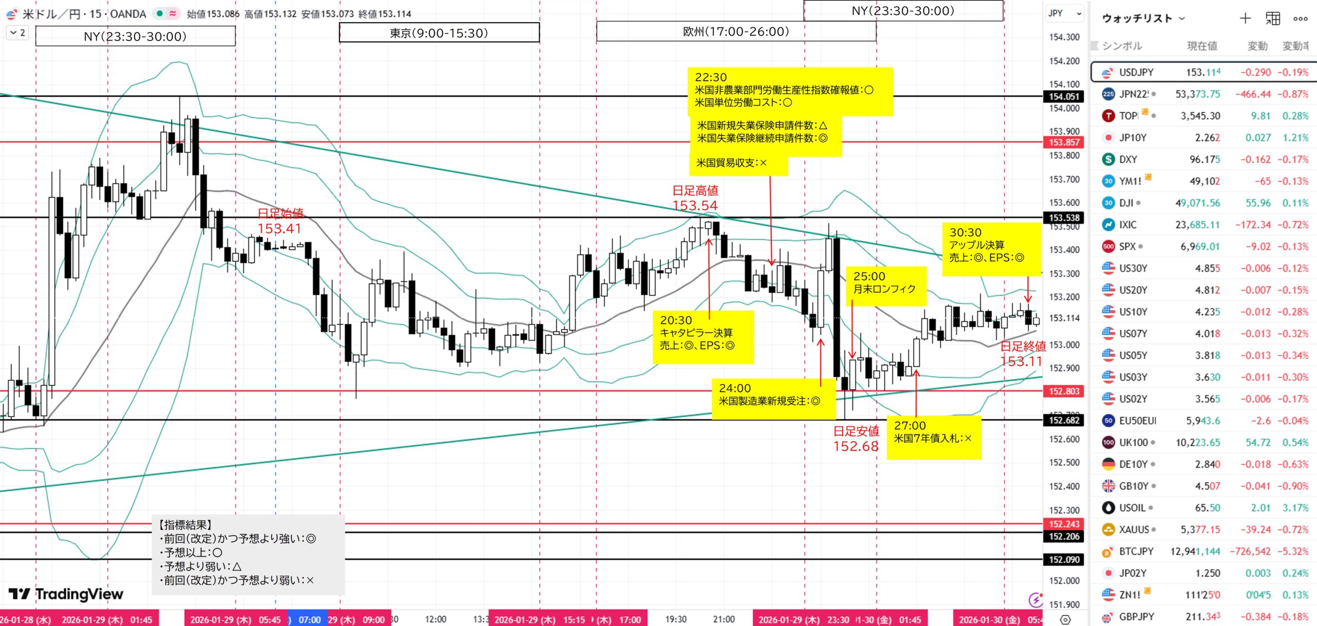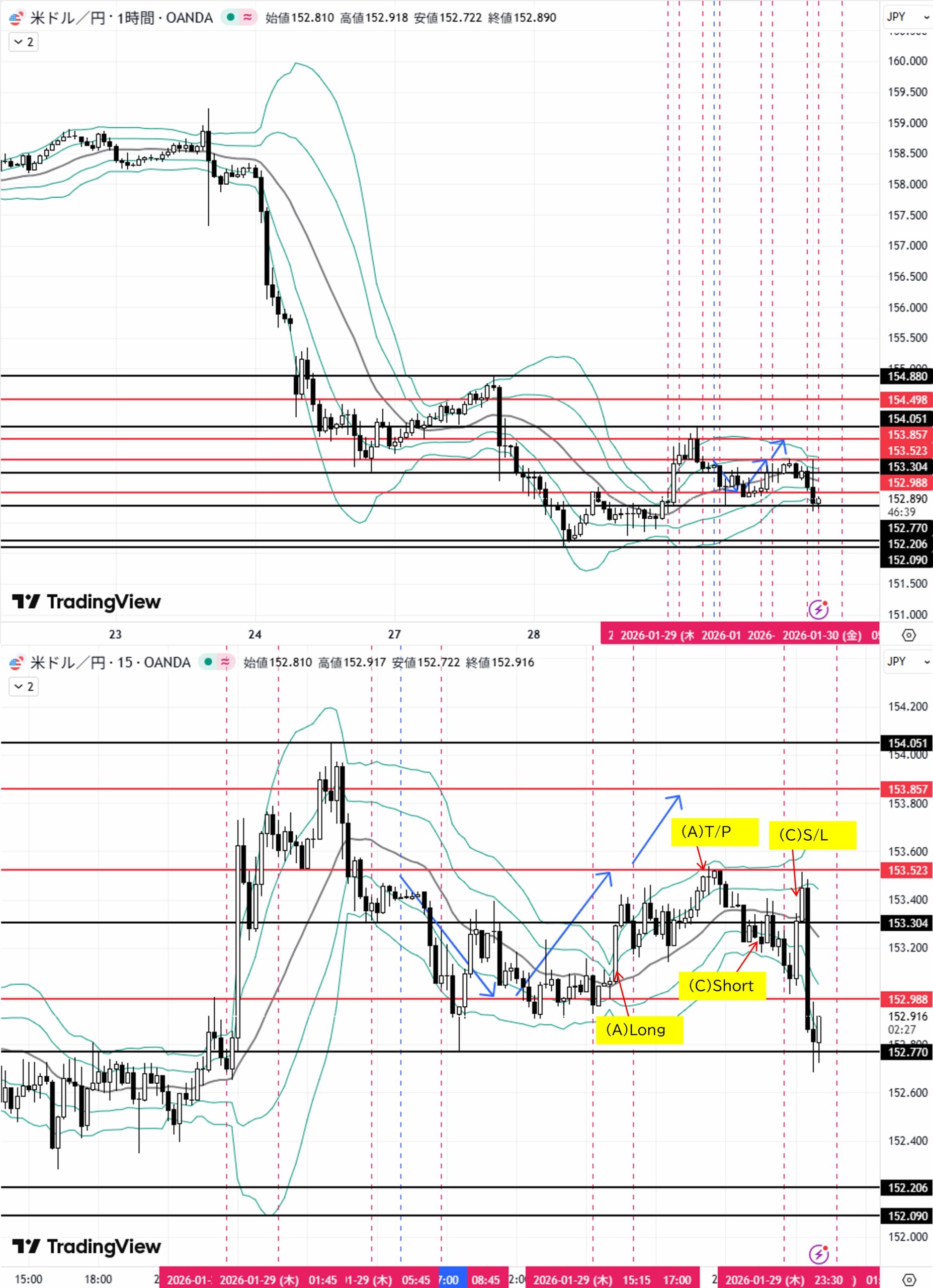 (B) (A)後、1H足押し安値153.523をダウ上昇→目標1H足ダウ高値153.857
