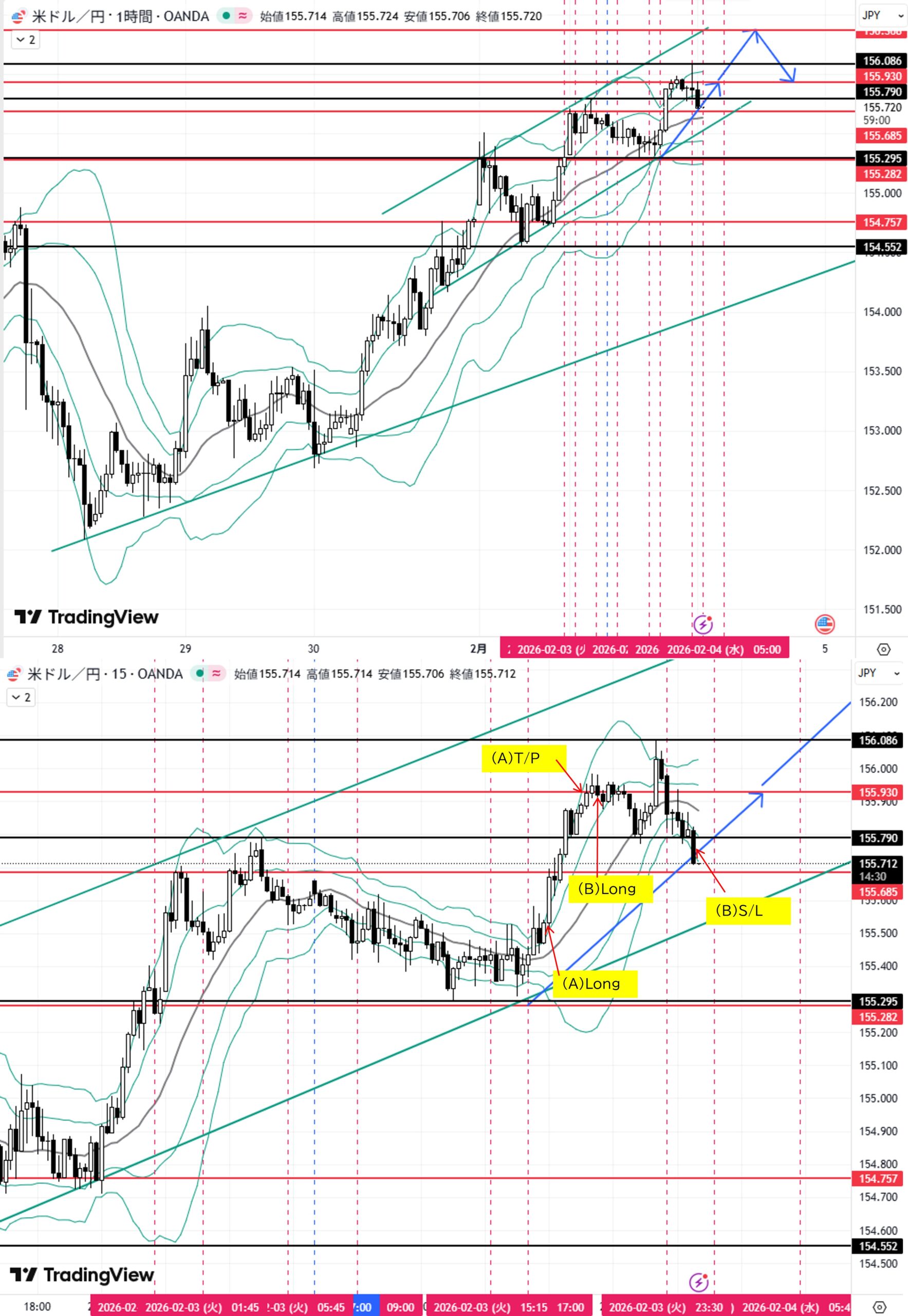 (A)1H足ダウ高値155.282付近へ下落→転換上昇→目標日足押し安値155.930