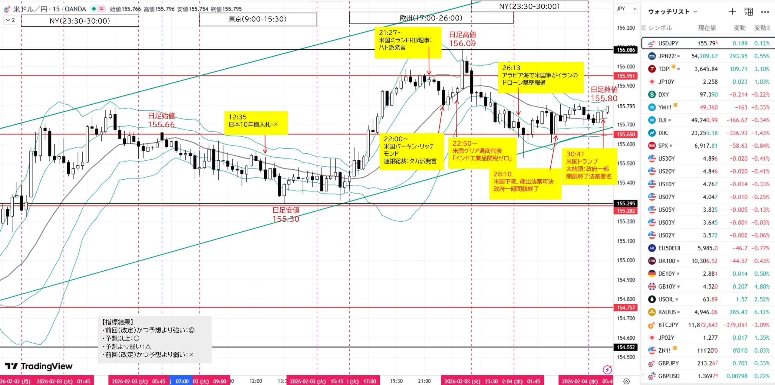 (B)日足押し安値155.930をダウ上昇→目標日足押し安値156.368