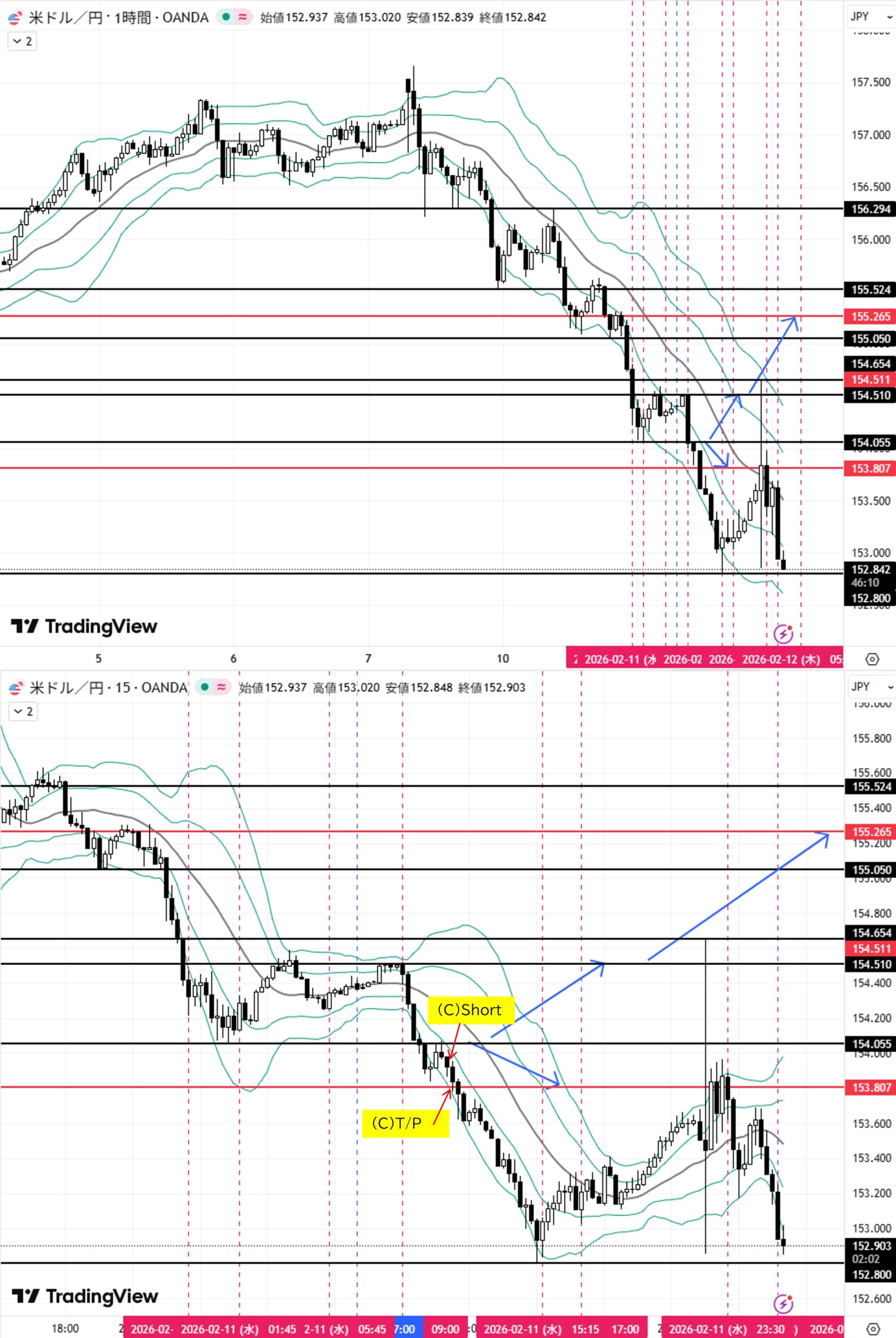 (C)日足安値154.055をダウ下落→目標1H足押し安値153.807