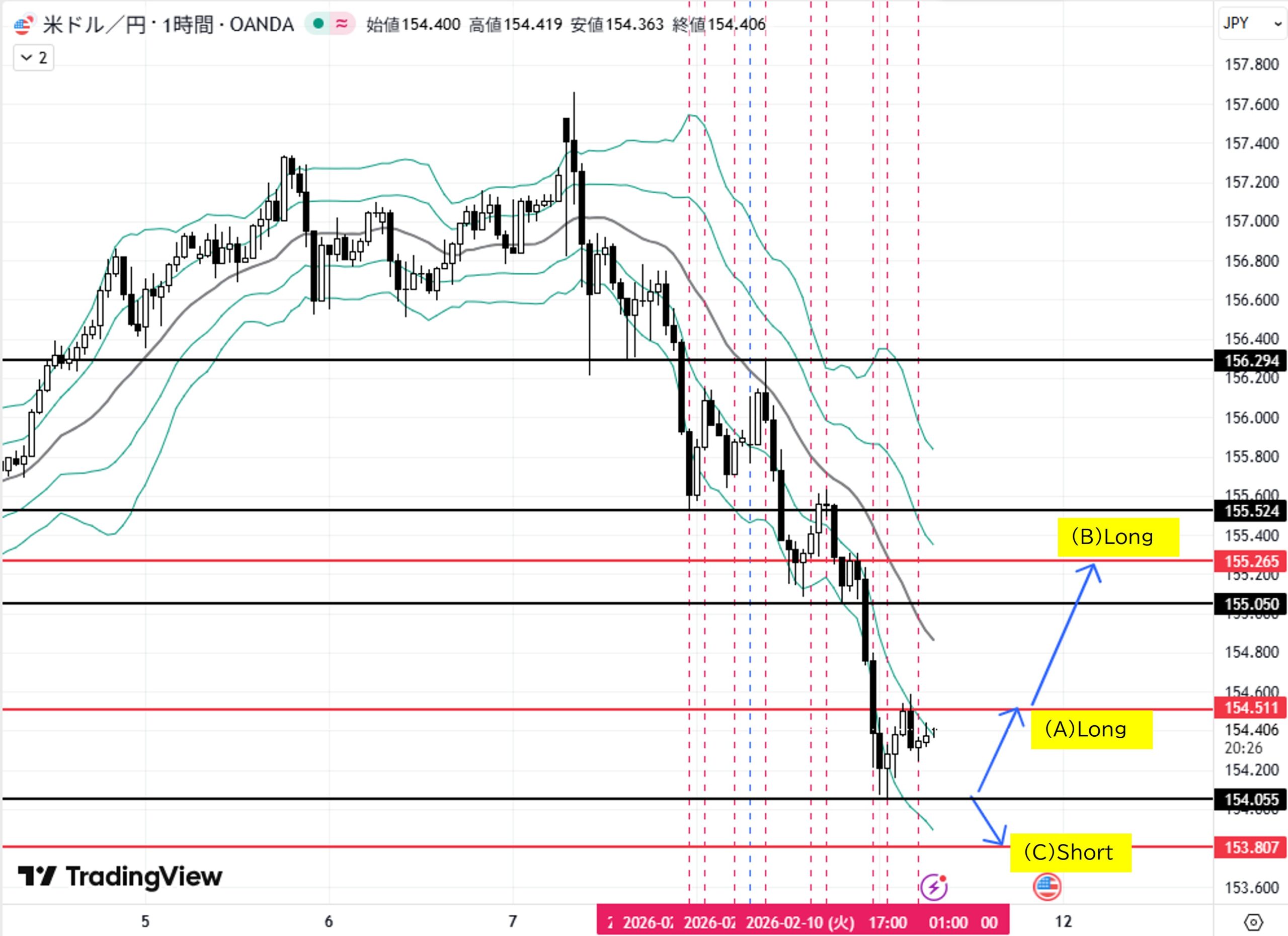(A)日足安値154.055付近へ下落→転換上昇→目標1H足ダウ高値154.511