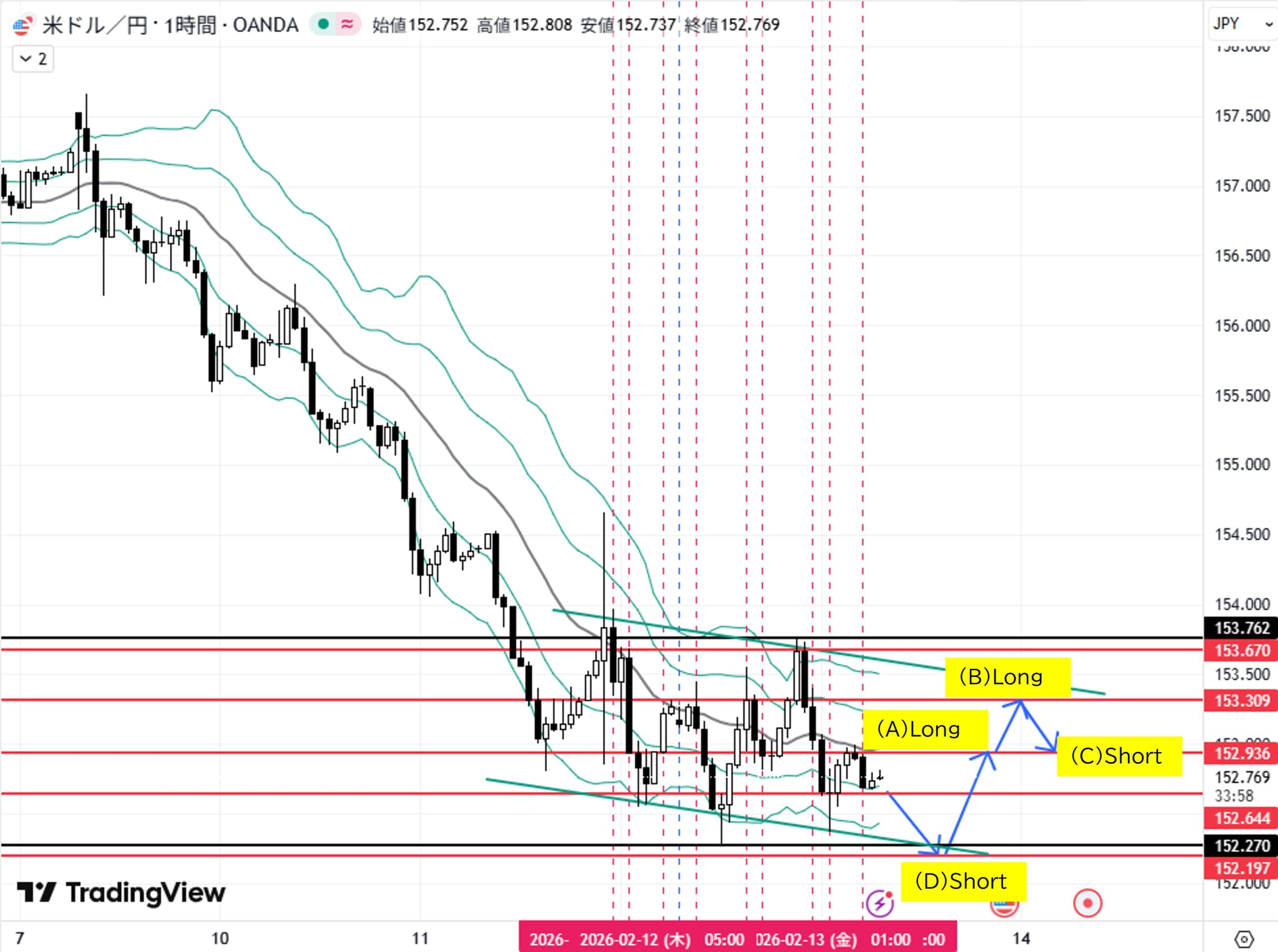 (A)日足レンジ安値152.197付近へ下落→転換上昇→目標1H足レンジ高値152.936
