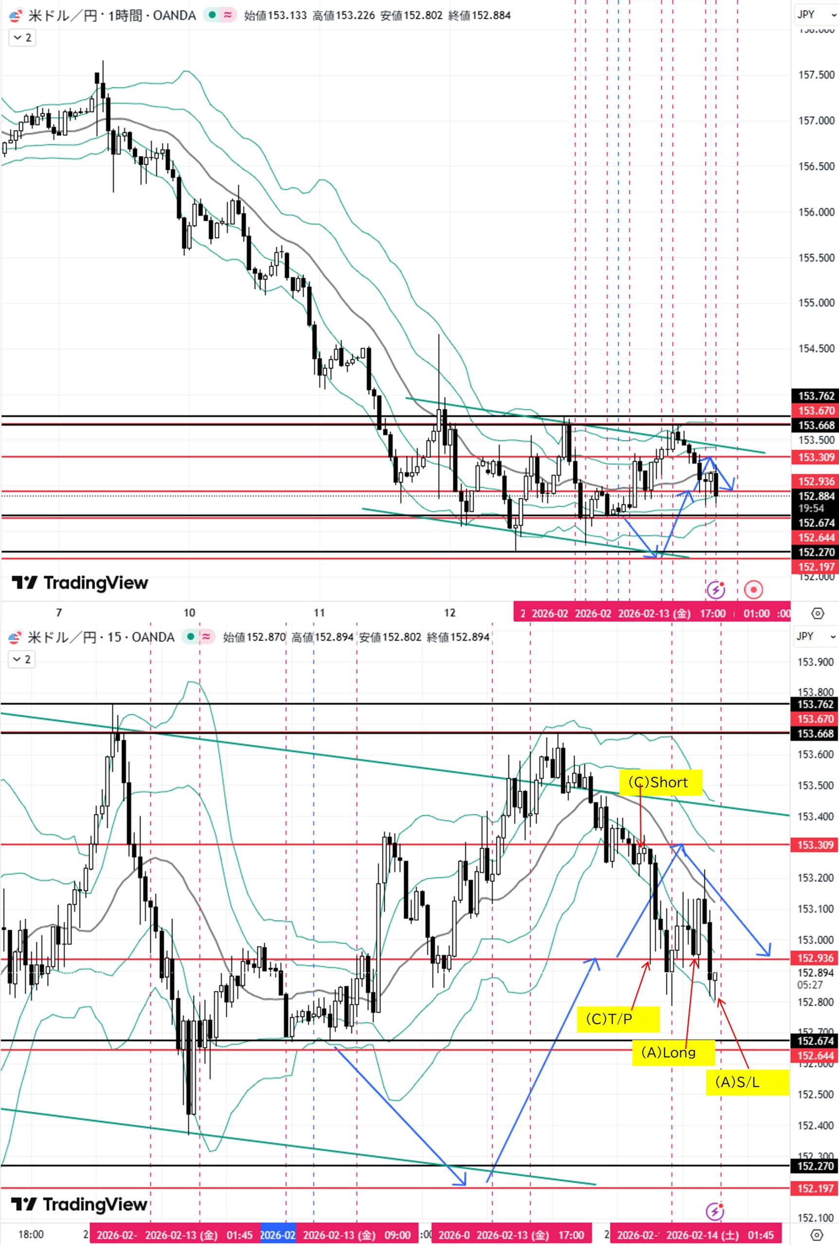 (B)1H足レンジ高値152.936をダウ上昇→目標1H足三尊右肩153.309